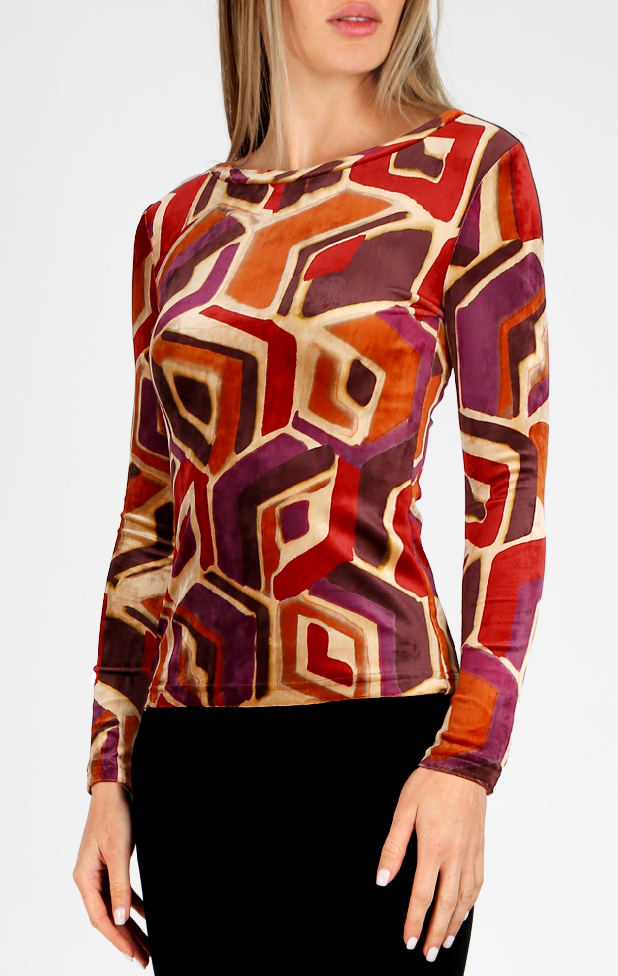 Блуза от кадифе с лодка деколте в графичен десен в цвят Brick и Plum Purple на бежов фон