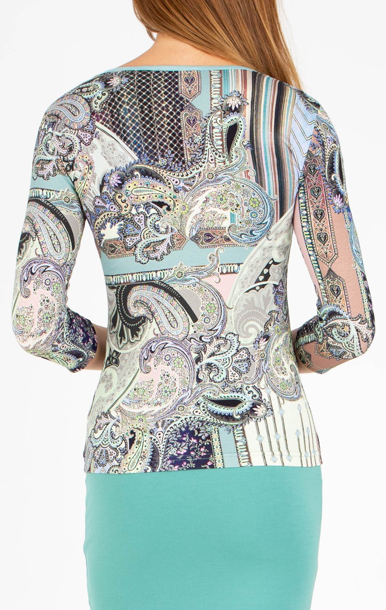 Удобна блуза от меко еластично трико с пейсли мотиви в нежна синьо-зелена гама. Моделът е класически с втален силует, V-образно деколте и 3/4 ръкав. Подходяща е за всеки тип фигура и може да се комбинира с изчистен едноцветен панталон или пола. Разположението на щампата може да варира в зависимост от размера.
