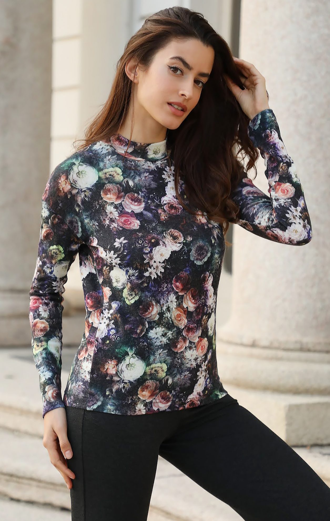 Блуза с цветен флорален принт в свободен силует с ниска поло яка, изпълнена от плътна топла и мека материя - тя е толкова уютна, че със сигурност ще се превърне в една от най-любимите ви дрехи за студения сезон. Красивият стилизиран флорален принт добавя елегантност и романтична нотка към вашия аутфит. Предлага се в размери от S до 3XL.