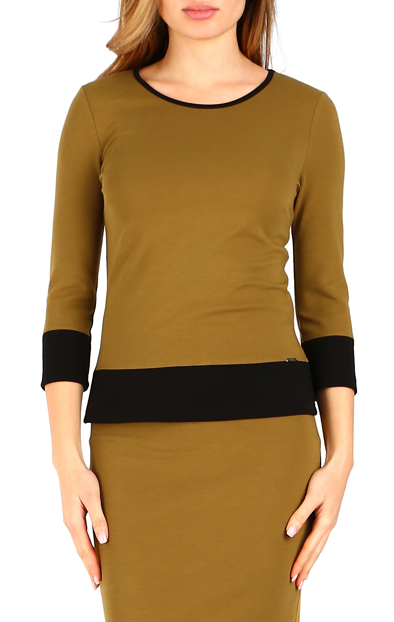Стилна блуза от плътна и стегната трикотажна материя цвят Bronze Mist, с обло деколте, завършено с черно бие, с 3/4 ръкав и ефектно завършване при подгъва и ръкавите с широка черна лента. Стегнатата материя моделира фигурата за безупречен силует. Универсален модел, който може лесно да комбинирате с поли или панталони и е подходящ както за офиса, така и за неформални срещи в забързаното ежедневие. Съчетайте с пола в същия десен от колекцията на Daphne.