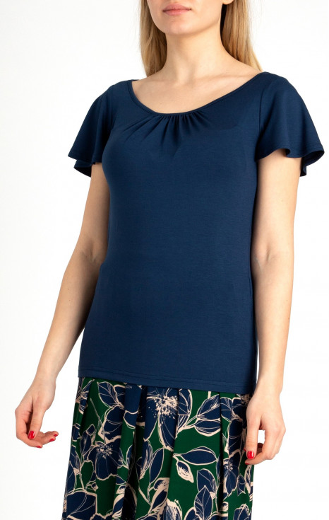Блуза от меко трико в син цвят. Моделът е с обло деколте с набор и къс ръкав.