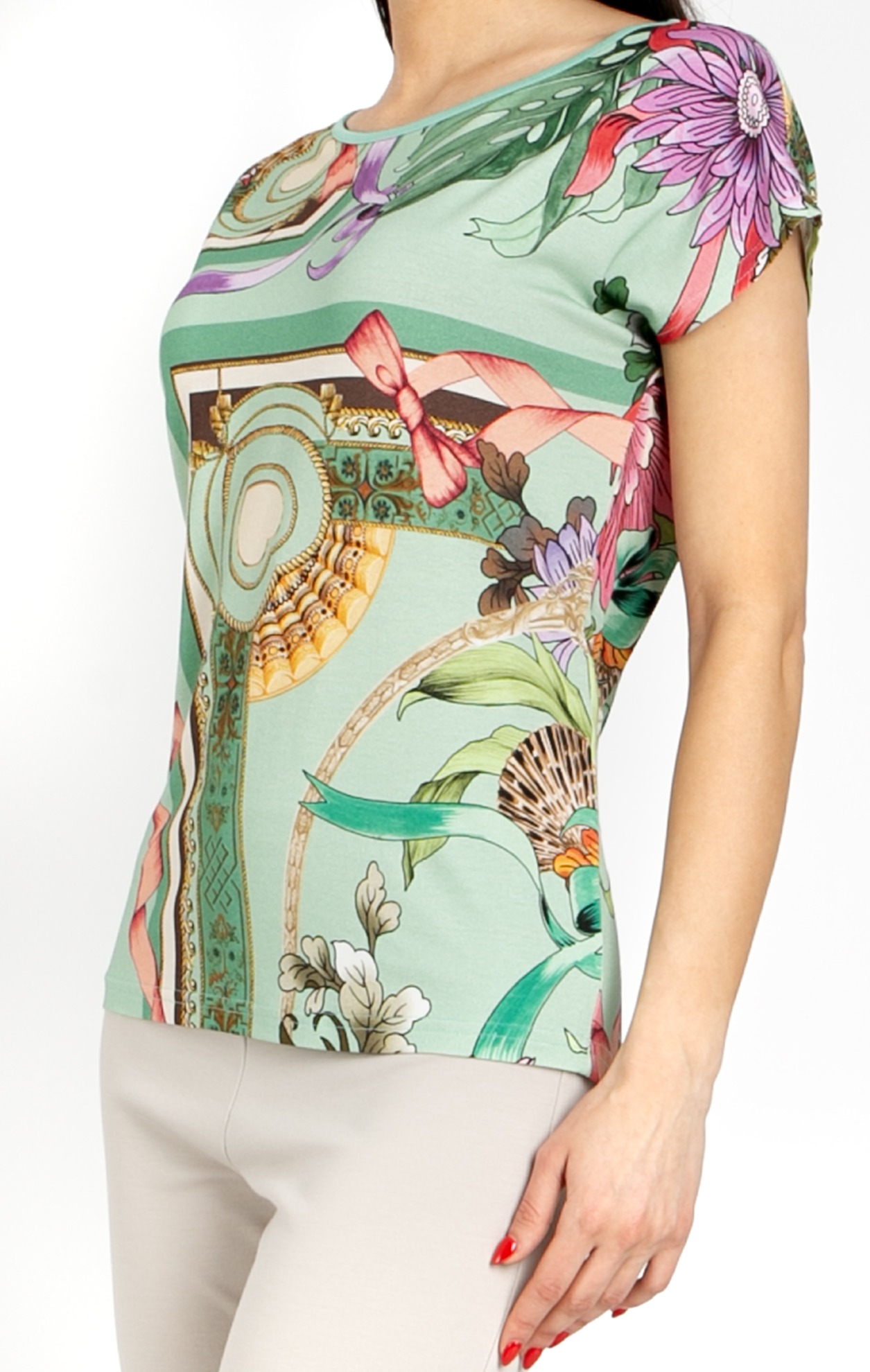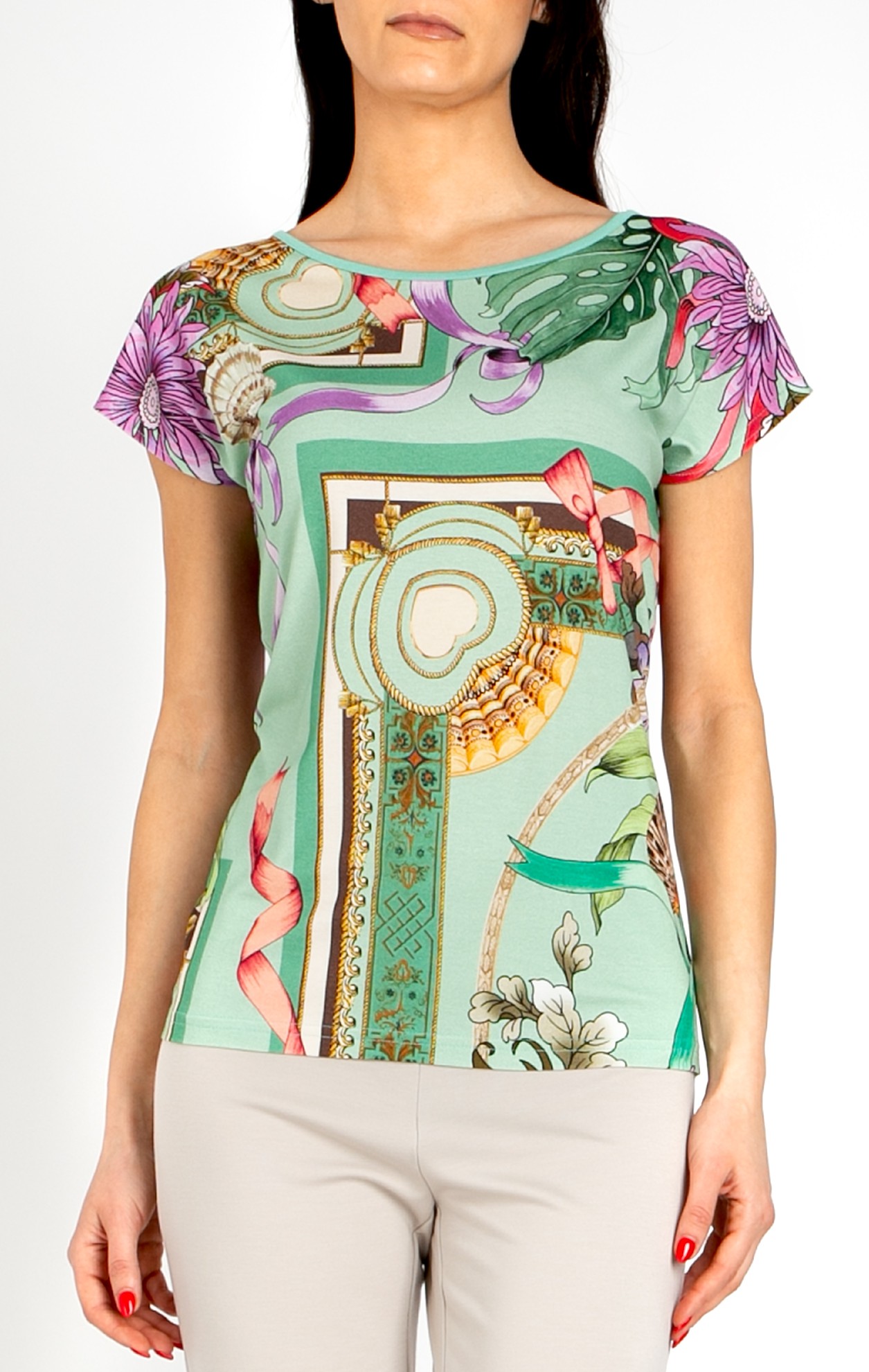 Блуза в цвят Aqua Green с бароков принт и флорални мотиви. Моделът е в свободен силует, с паднало рамо и лодка деколте завършено с бие. Решена в богат принт от нежни хризантеми в лилаво и розово, съчетани с деликатни орнаменти, панделки и морски елементи. Свежата зелена основа придава на модела лекота и пролетно излъчване.