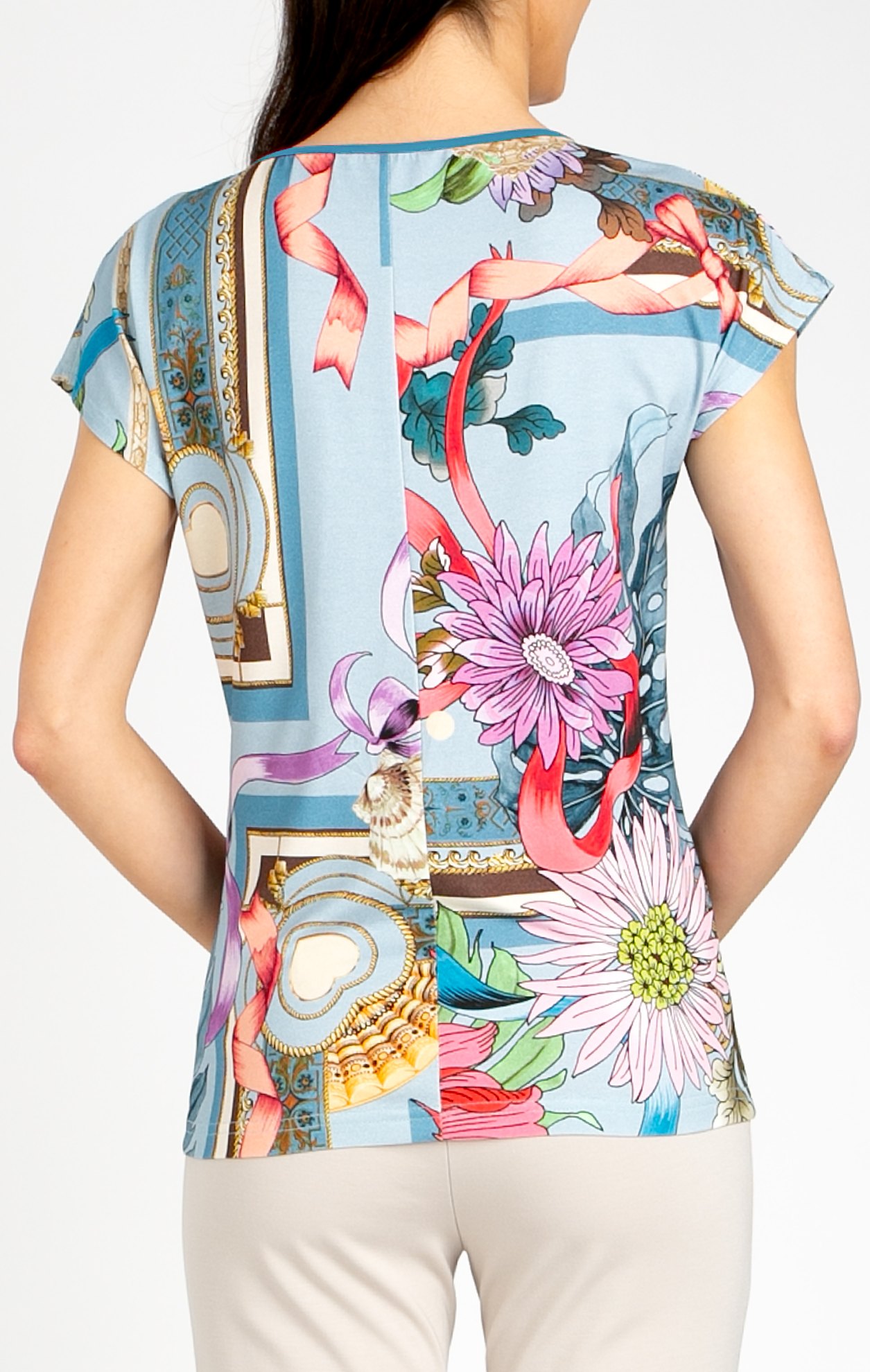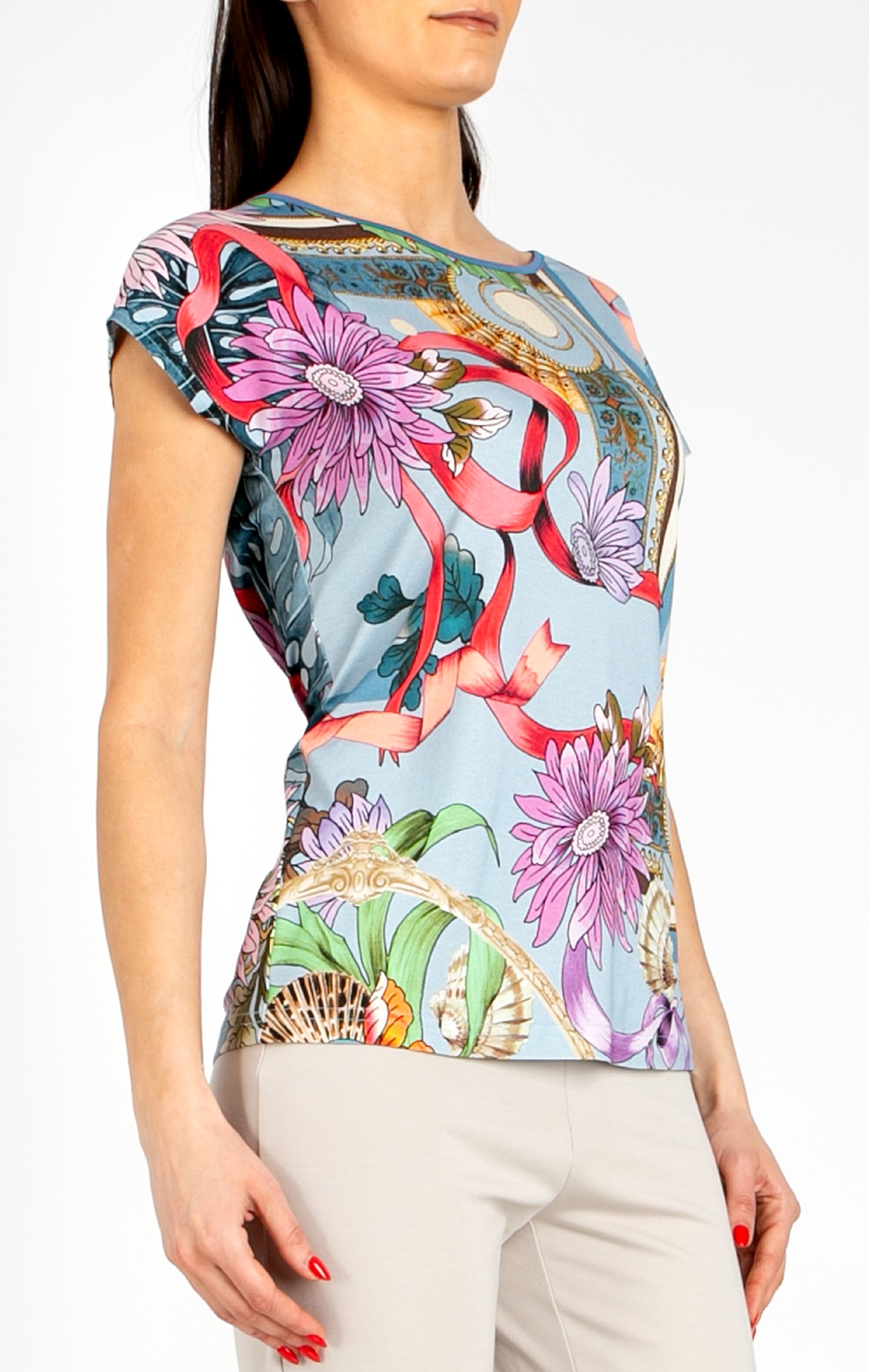 Блуза в цвят Baby Blue с бароков принт и флорални мотиви. Моделът е в свободен силует, с паднало рамо и лодка деколте завършено с бие. Решена в богат принт от нежни хризантеми в лилаво и розово, съчетани с деликатни орнаменти, панделки и морски елементи. Свежата светлосиня основа придава на модела лекота и пролетно излъчване.