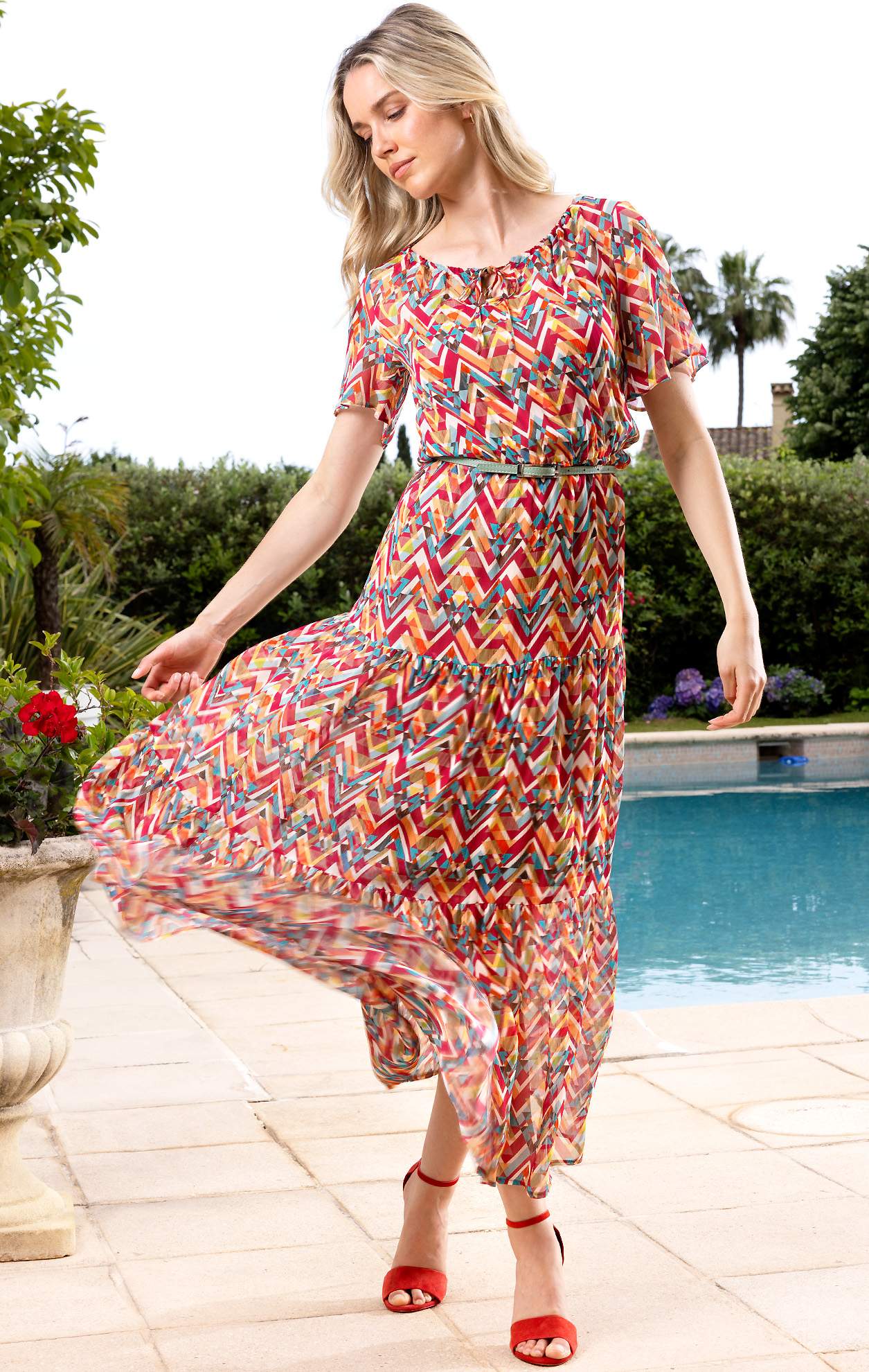 Ефирна дълга рокля с волани от крепирана вискоза с с артистичен геометричен зиг-заг десен в топлата коралова гама. Деколтето може да се регулира с вградена дълга връзка. Фината, жива материя се движи с всяко движение на тялото, придавайки усещане за лекота и ефирност, а модерната кройка с волани създава елегантен и женствен силует. Нежна и лека, тази рокля е създадена да подчертае вашата индивидуалност и стил. Детайли: