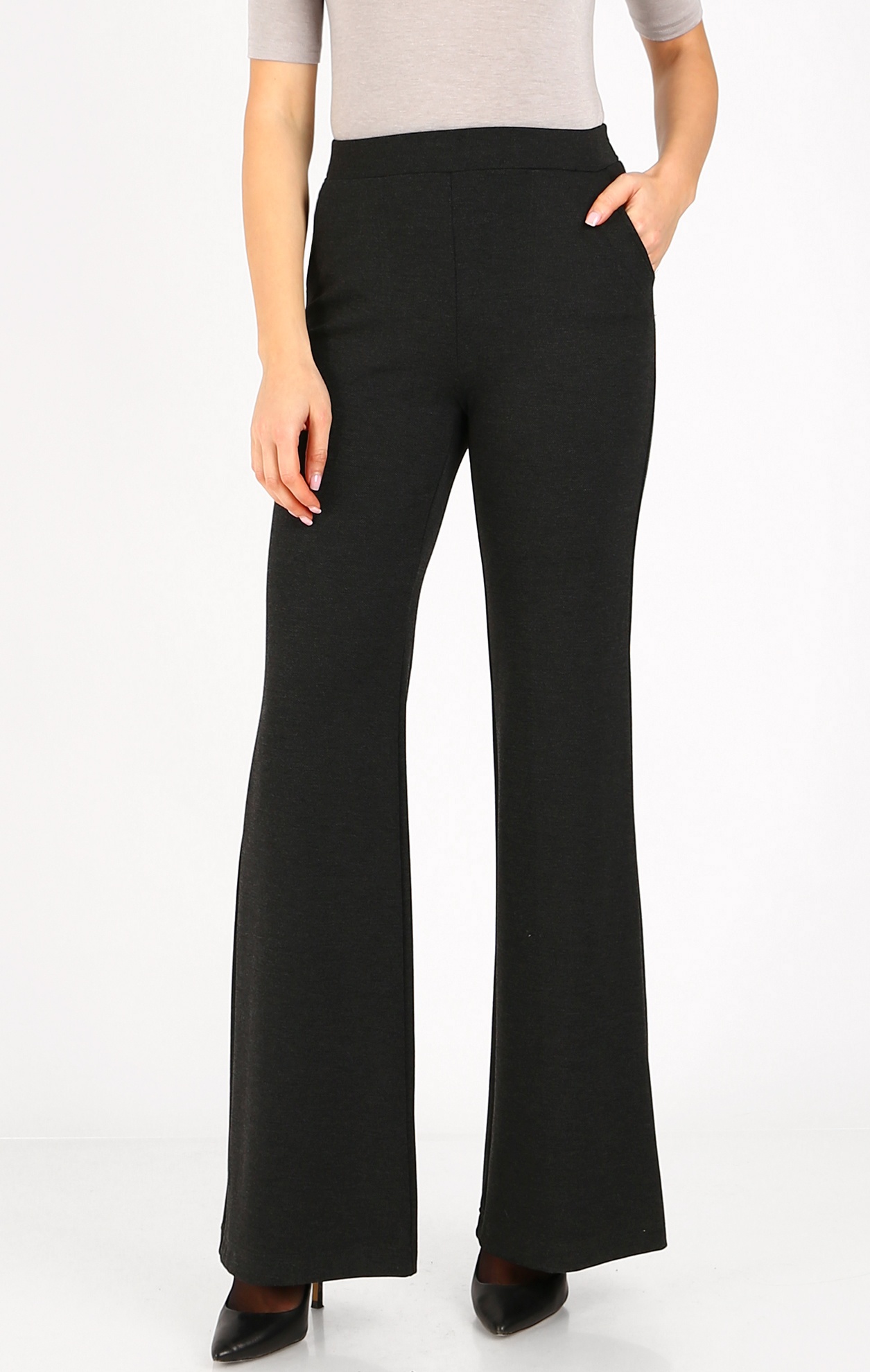 Елегантен панталон, изпълнен от стегната трикотажна материя в цвят “графит меланж”. Моделът подчертава извивките на ханша и бедрата, плавно се разширява към подгъва и издължава фигурата. Талията е завършена с широк ластик за повече комфорт. Изключително стилен панталон, подходящ за офиса и неформални събития . Може да се съчетае с блуза или елегантно сако от разнообразната колекцията на Daphne.