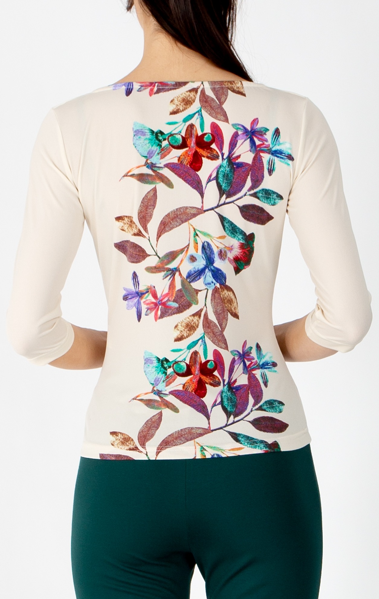 Стилна блуза с драпирано деколте в цвят Vanilla Ice с вертикален флорален бордюр, който визуално издължава силуета. Моделът е втален, с 3/4 ръкав и ефектно драпирано деколте, което красиво подчертава шията, изработен от еластично трико тип жарсе. Универсален модел, който лесно се комбинира със сака, жилетки или панталони - идеален избор за съвременна градска визия.