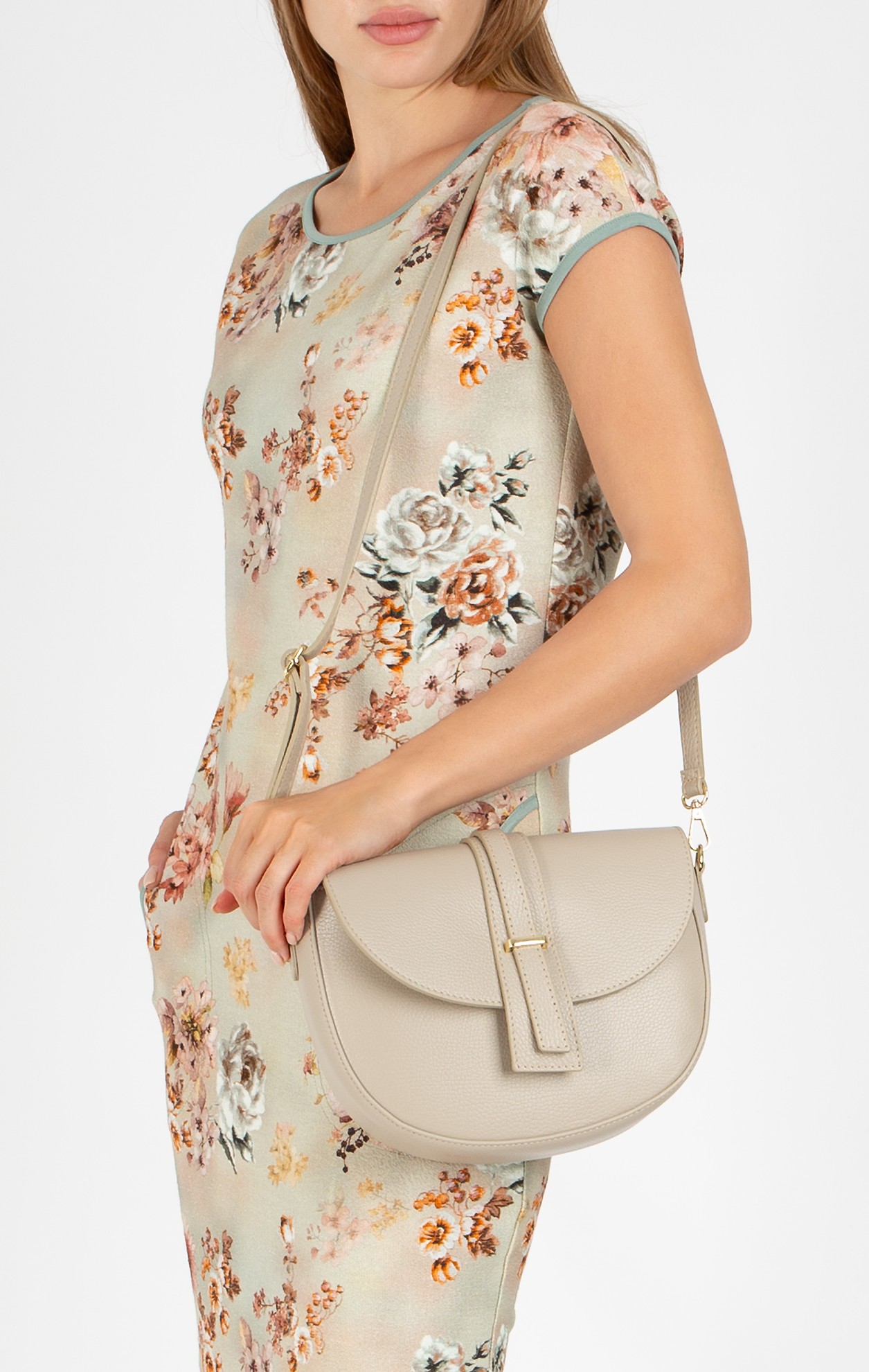 Малка стилна чанта от естествена кожа. Затваря се с капак и магнитно копче като има и допълнителен цип за повече сигурност. Моделът е с едно основно отделение и два малки вътрешни джоба. Чантата разполага с дълга регулируема дръжка, която лесно се сваля и слага.