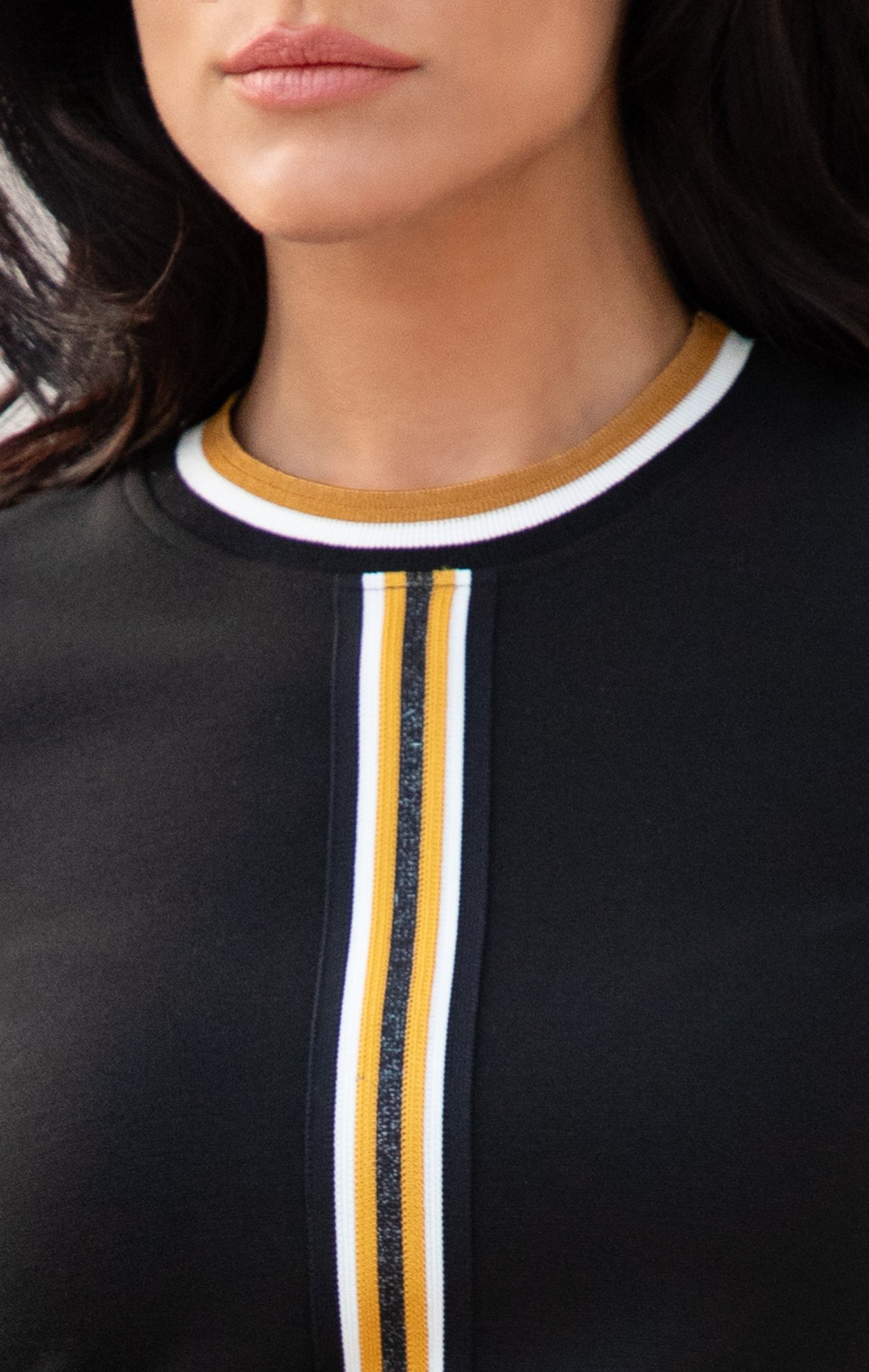 Елегантна черна блуза от стегнато трико с декоративна лента в бяло, горчица и черно райе с деликатен блясък. Моделът е с къс ръкав, затворено обло деколте завършено с луксозно трицветно плетено бие. Подходящ както за офиса, така и за стилна ежедневна визия.
