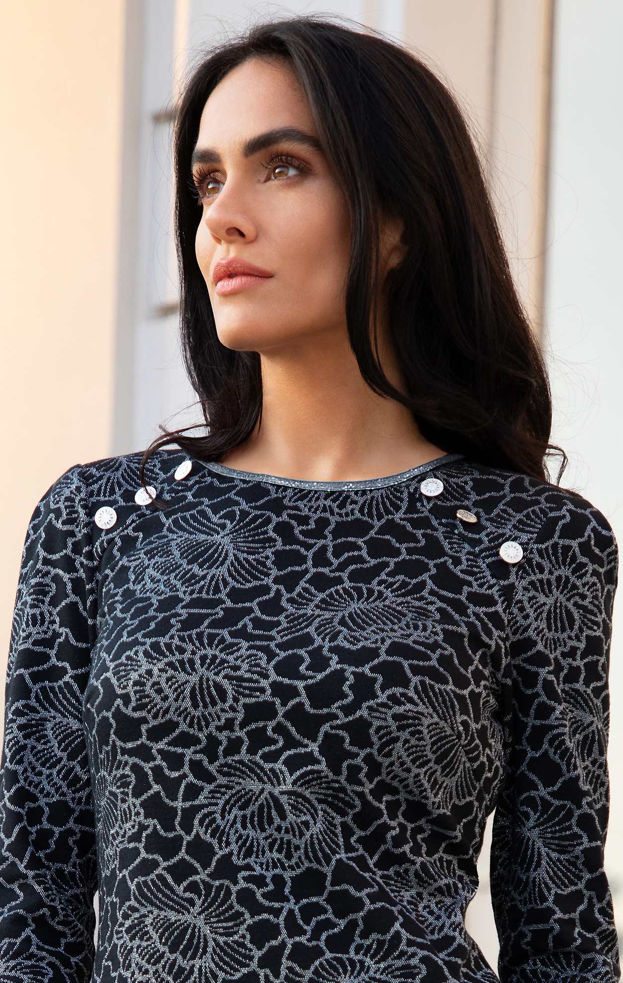 Елегантна и стилна рокля, изработена от луксозен трикотажен жакард в черно с красиви флорални мотиви и сребристи нишки. С изчистен и леко втален силует, моделът деликатно следва линията на тялото и осигурява луксозно и комфортно усещане през целия ден. Ръкавите са с чупки и лек обем при рамото и с 3/4 дължина, което прави роклята подходяща за носене през няколко сезона. Декоративните метални копчета на рамото са акцент към модерната ѝ и изискана визия. Перфектен избор за вечерни излизания, бизнес срещи или за моментите, в които желаете да добавите стилна елегантност и блясък в ежедневието си.