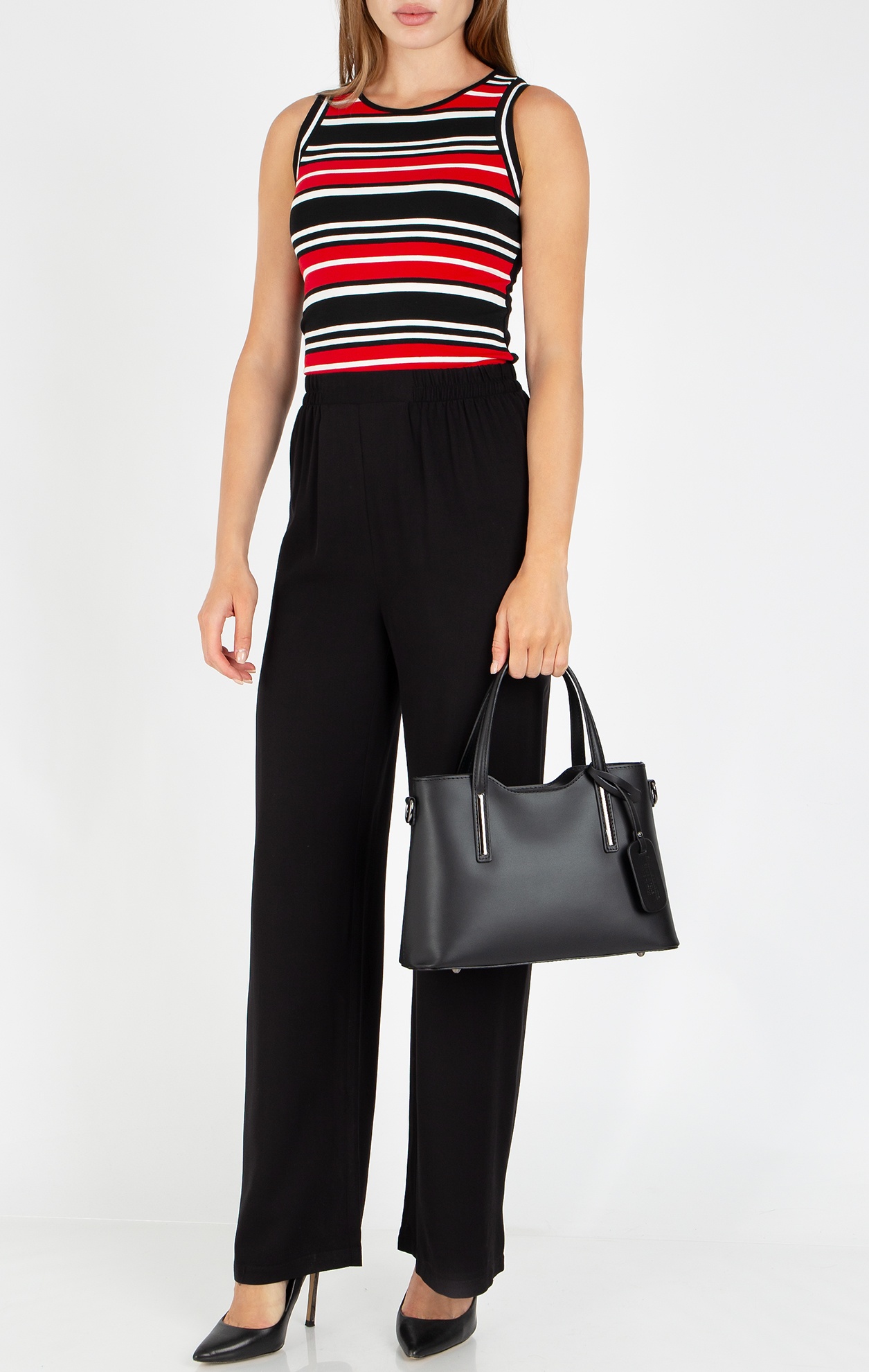Елегантна черна дамска чанта от гладка естествена кожа. Моделът се затваря с цип, с три самостоятелни отделения, средното се затваря с цип, допълнително има малък вътрешен джоб с цип и отделение за телефон и аксесоари. Изчистената визия се допълва от елегантни сребърни елементи в основата на дръжките.