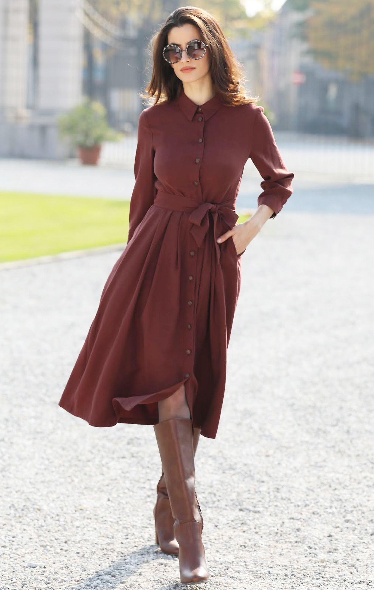 Миди рокля от луксозна материя с модал - дишаща и приятна на допир, с фин крепиран финиш. Моделът е с разкроена долна част, с две групи дълбоки чупки, които падат красиво към подгъва, а талията е елегантно подчертана с допълнителен колан. С класическа яка, закопчаване с копчета отпред и 3/4 ръкави с маншети, роклята предлага стил и комфорт, а дискретните странични джобове придават съвременен функционален акцент. Тази рокля съчетава комфорт и лукс, превръщайки се в перфектен избор както за специални поводи, така и за елегантно ежедневие.