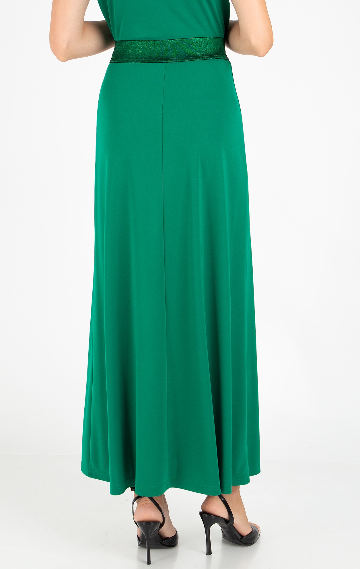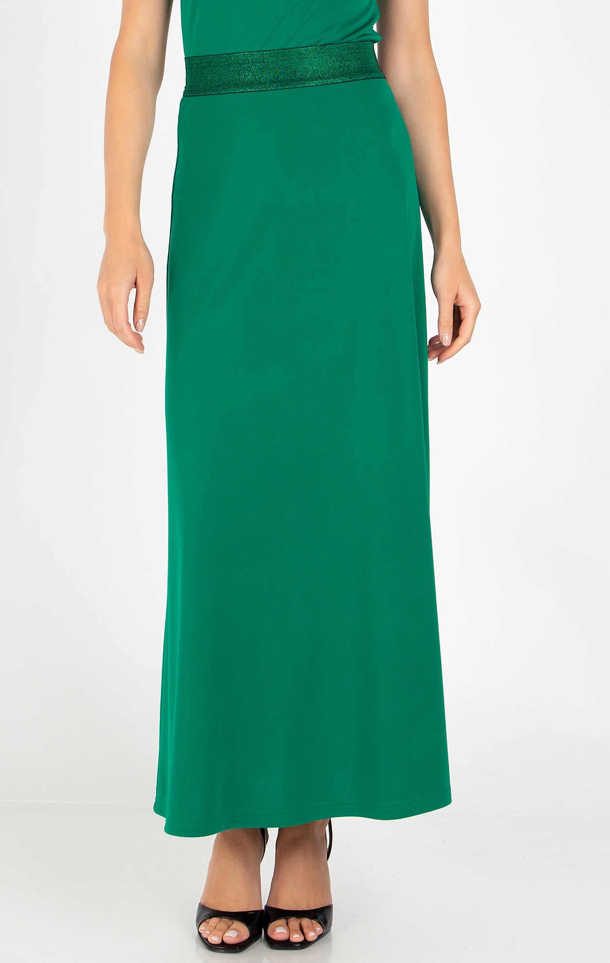 Елегантна пола от трикотажна материя тип “жарсе” в наситен зелен цвят Ultramarine Green, завършена с широк декоративен ластик с блестящи нишки и изящно разкроена от ханша. Гладката и тежко падаща материя създава усещане за изисканост и комфорт. Полата стои добре на всяка фигура и е лесна за съчетаване с различни цветове блузи.