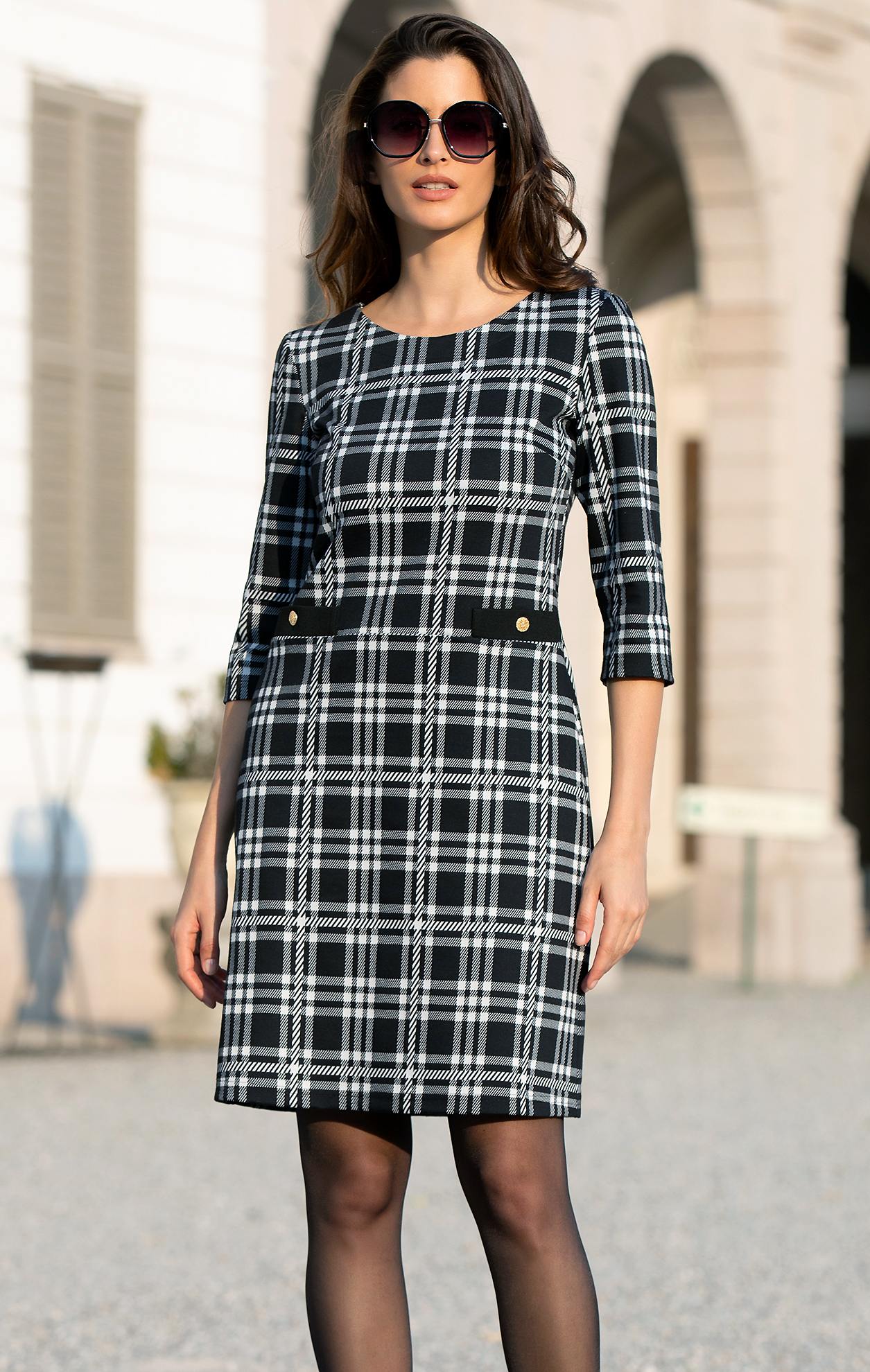 кройка в класическо черно-бяло каре. Правият силует леко следва линията на