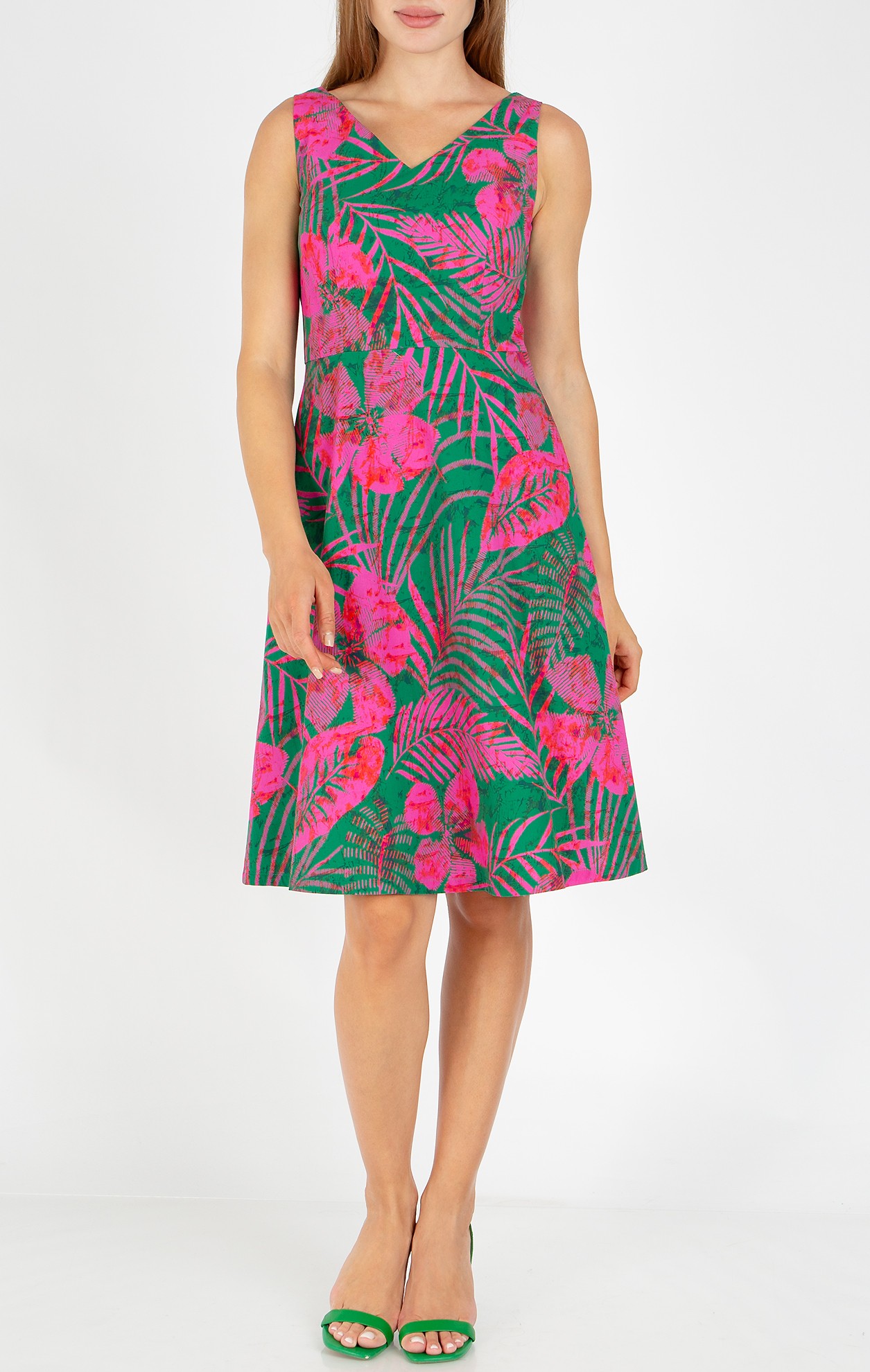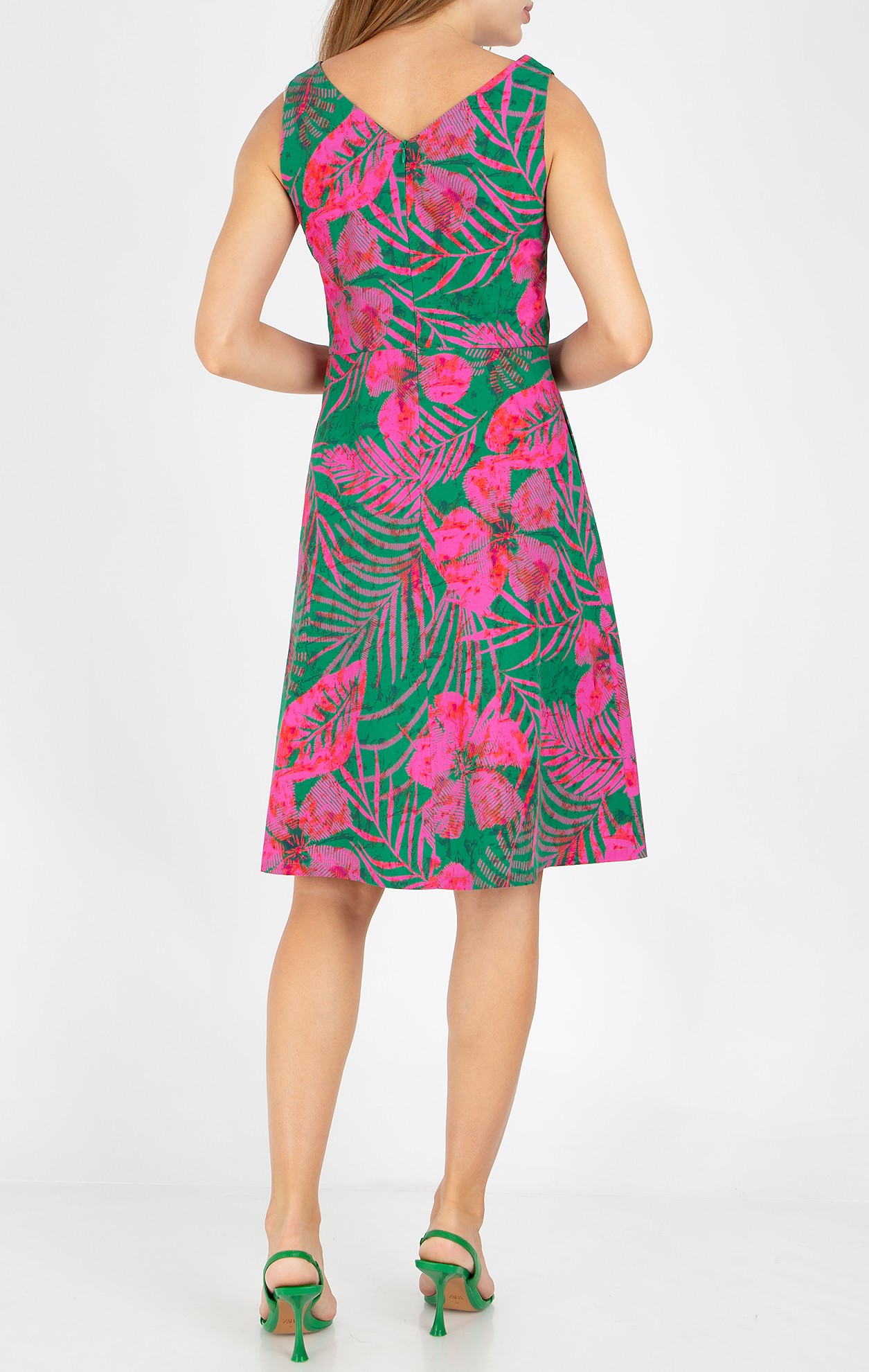 Красива рокля от 100% памук, която ще внесе стил и класа в гардероба на всяка дама. Наситеният и ярък десен в Evergreen и Fuchsia Rose добавя свежест и дързост към класическата кройка на роклята. Моделът е с вталена горна част и разкрояване от талията, което придава на силуета женственост и грация. Роклята е прекрасен избор за дами, които държат не само на елегантността в своето ежедневие, но и на практичността на естествената материя и удобството на страничните джобове. За завършек на визията съчетайте с колан от колекцията на Daphne.