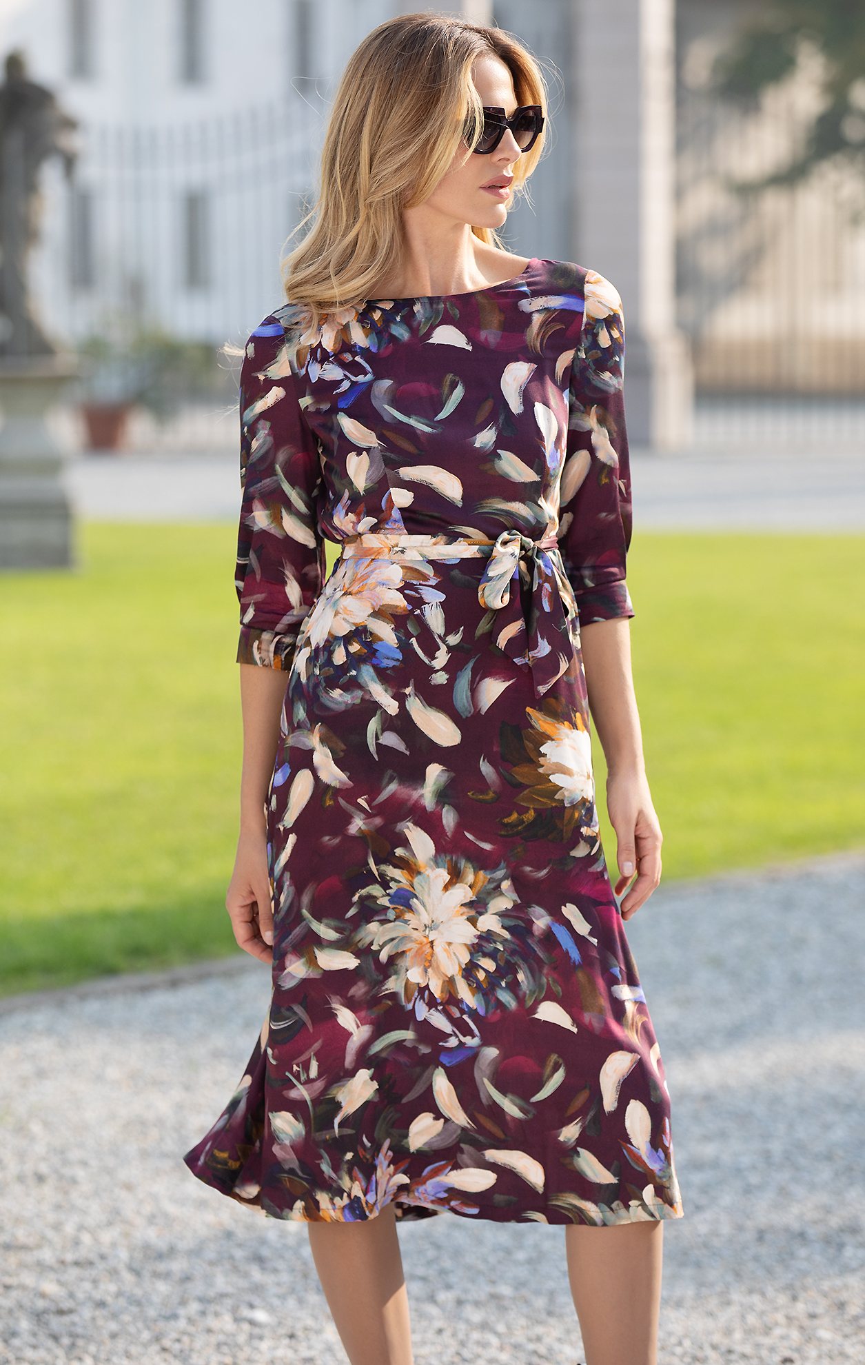 Елегантна рокля от луксозна вискоза в цвят Grape Wine с живописен флорален принт