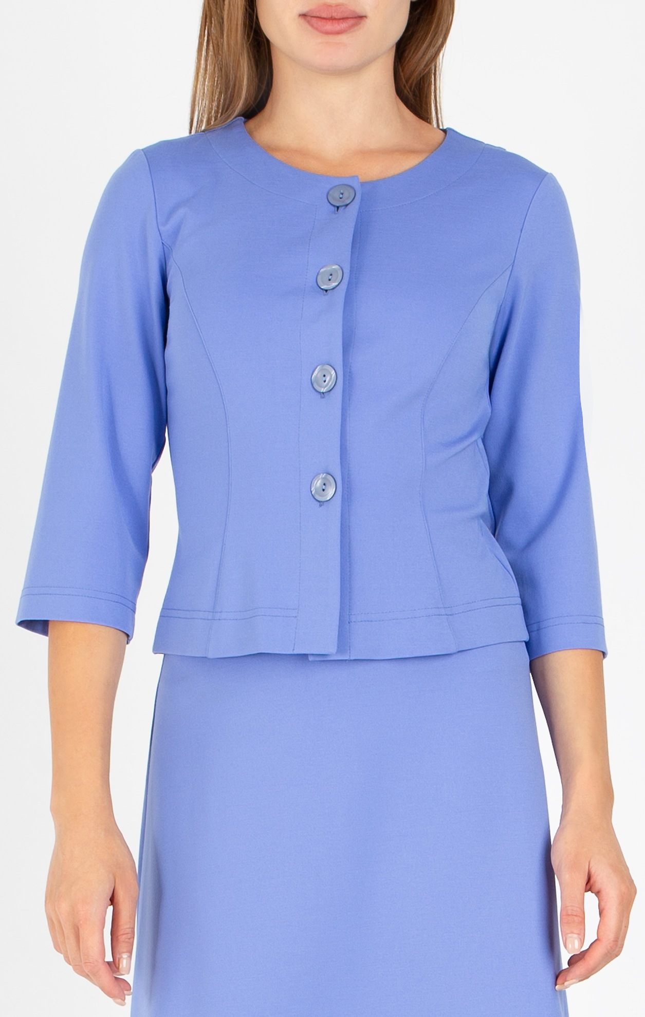 Елегантно сако с изчистен втален силует във виолетово син цвят, който привлича вниманието и носи усещане за нежност и женственост. Моделът е с дължина над ханша и с 3/4 ръкав, който го прави подходящ избор за топлите вечери или по-официални поводи. Може да се комбинира с пола Daphne от същия десен и да се добави шал от колекцията на Daphne за акцент и различна визия.