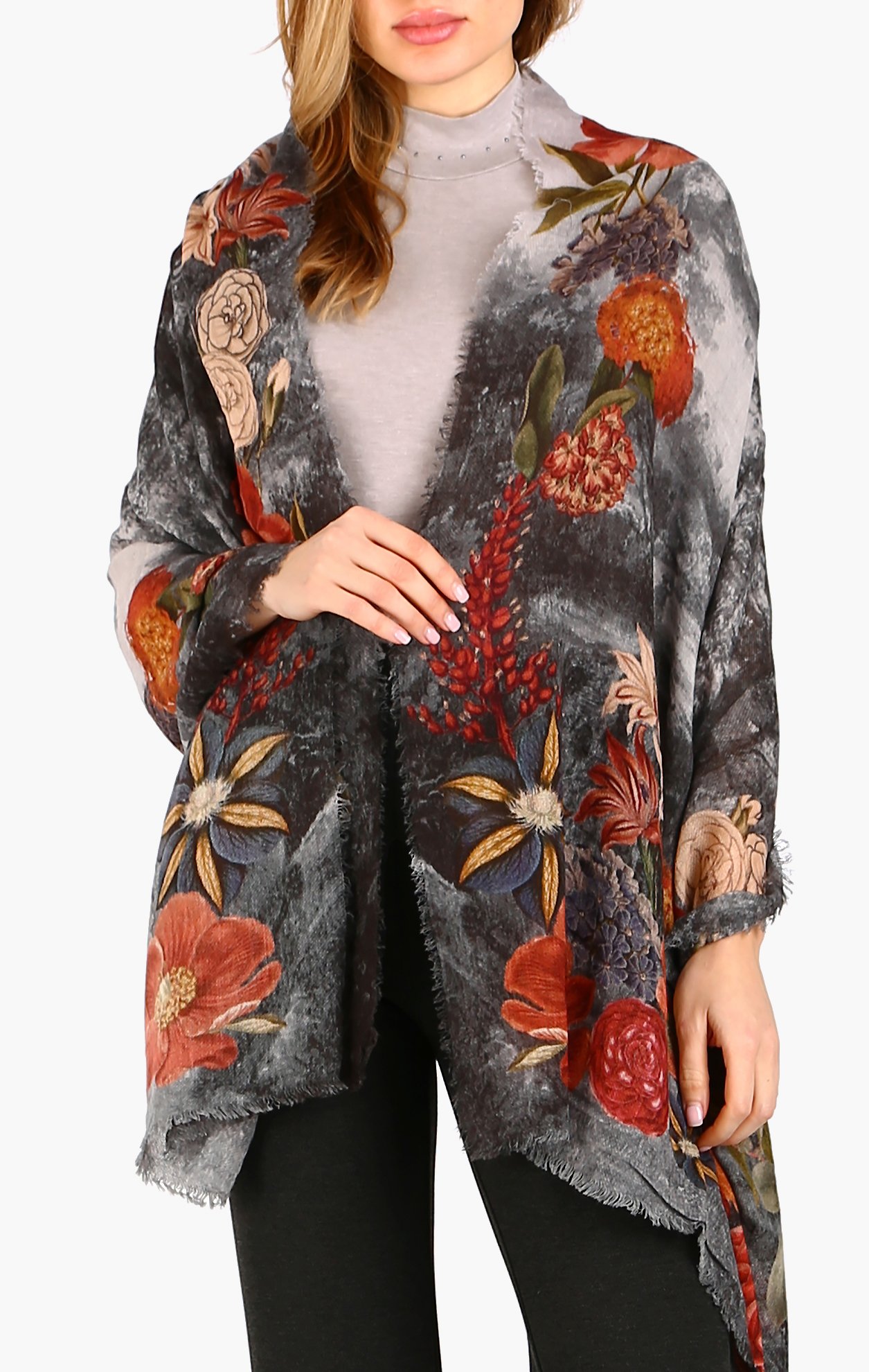 “Mystic Eternal Garden” е шал, който носи духа на тайнствена нощна градина. Тъмната, мраморна основа в графит и антрацит създава драматичен, почти мистичен фон, върху който ярките флорални мотиви изпъкват като живи: наситени червени цветове, златисти листа, коралови оттенъци и дълбоки винени нюанси. Лекият, пухкав завършек на материята придава допълнителна мекота, а щедрият размер позволява разнообразни стилове на носене, от елегантно наметнат върху раменете до небрежно навит около врата. Тайната на чара на “Mystic Eternal Garden” е в силата на детайла: богатите флорални форми, художественото разпределение на цветовете и скрита мистериозност. Това е шал, който не просто допълва визията, а разказва история. История за красота, дълбочина и непреходна женственост.