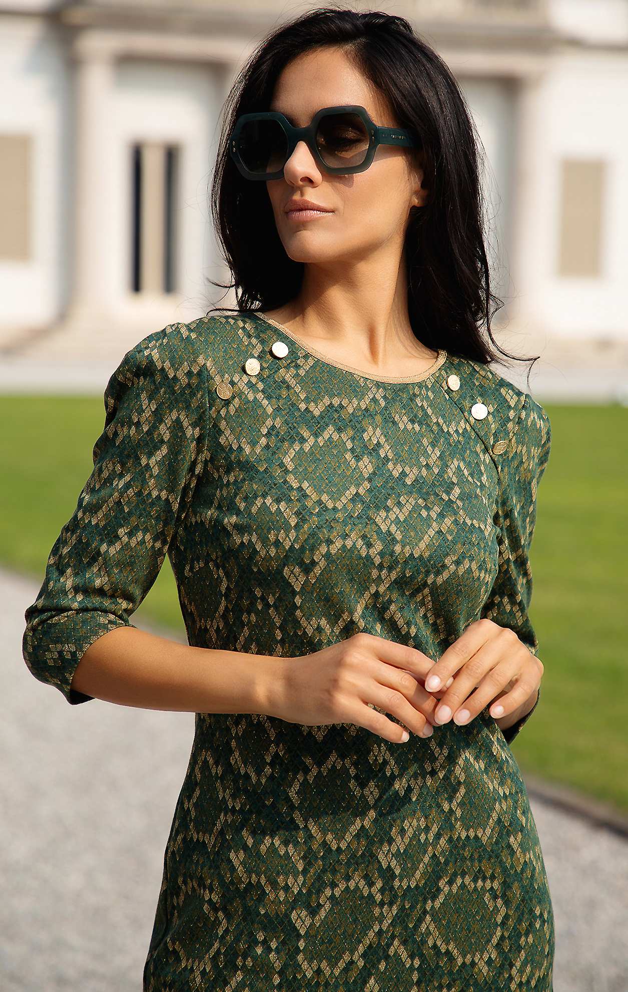 Елегантна рокля, изработена от висококачествен трикотажен жакард в Smoke Pine и Amber Green със златисти нишки в стилна интерпретация на абстрактни орнаменти и геометрични мотиви. Златистите нишки се преплитат в луксозна, изискана текстура, която придава на силуета изтънчен блясък, а декоративните копчета на раменете добавят деликатен акцент с модерна визия. Тази рокля следва линията на тялото и се усеща изключително комфортно, като запазва безупречна форма през целия ден и се превръща в идеалния избор за специални поводи, официални събития или впечатляващи дневни визии.