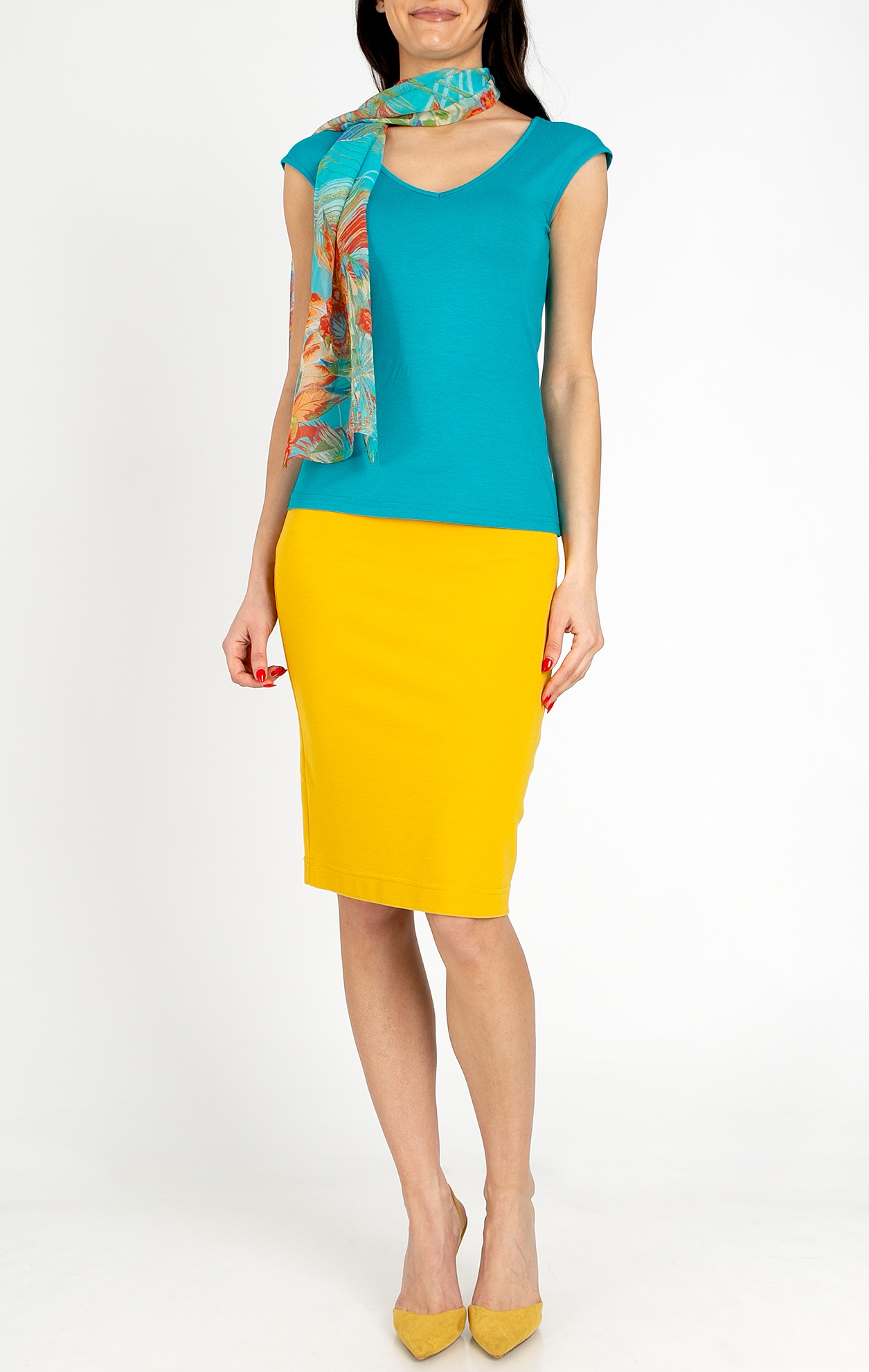 Класическа пола от еластична трикотажна материя с елегантна кройка тип молив в цвят Mimosa. Стегнатата и плътна материя оформя извивките в елегантен женствен силует, а широкият ластик в талията добавя удобство и комфорт. Моделът е с дължина до коляното, без подплата. Изпълнена в наситения и енергичен жълт цвят, тя е идеалното съчетание между строга елегантност и модерен колорит.