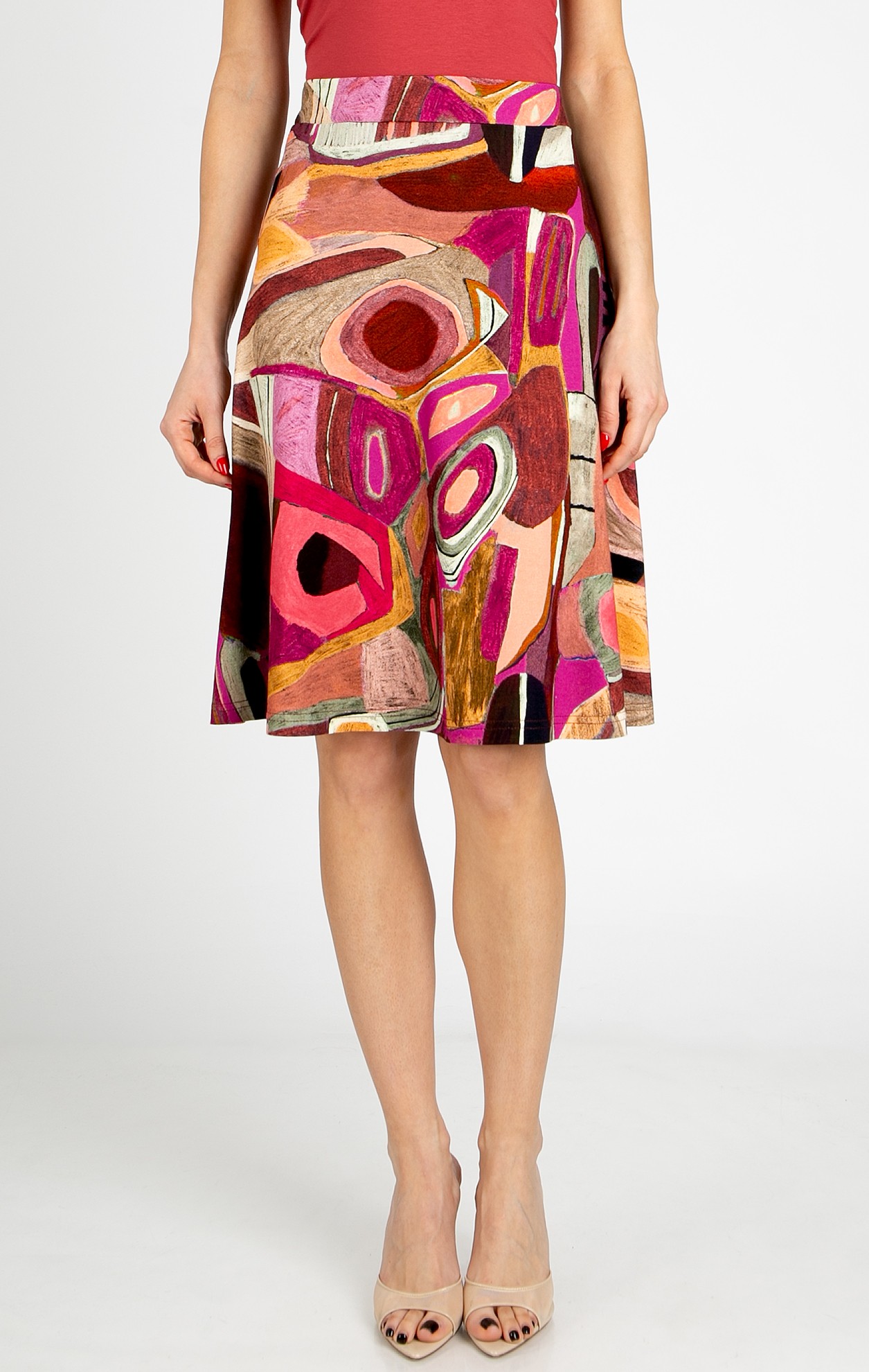 Къса разкроена пола от леко трико в графичен принт в Brick и Fuchsia