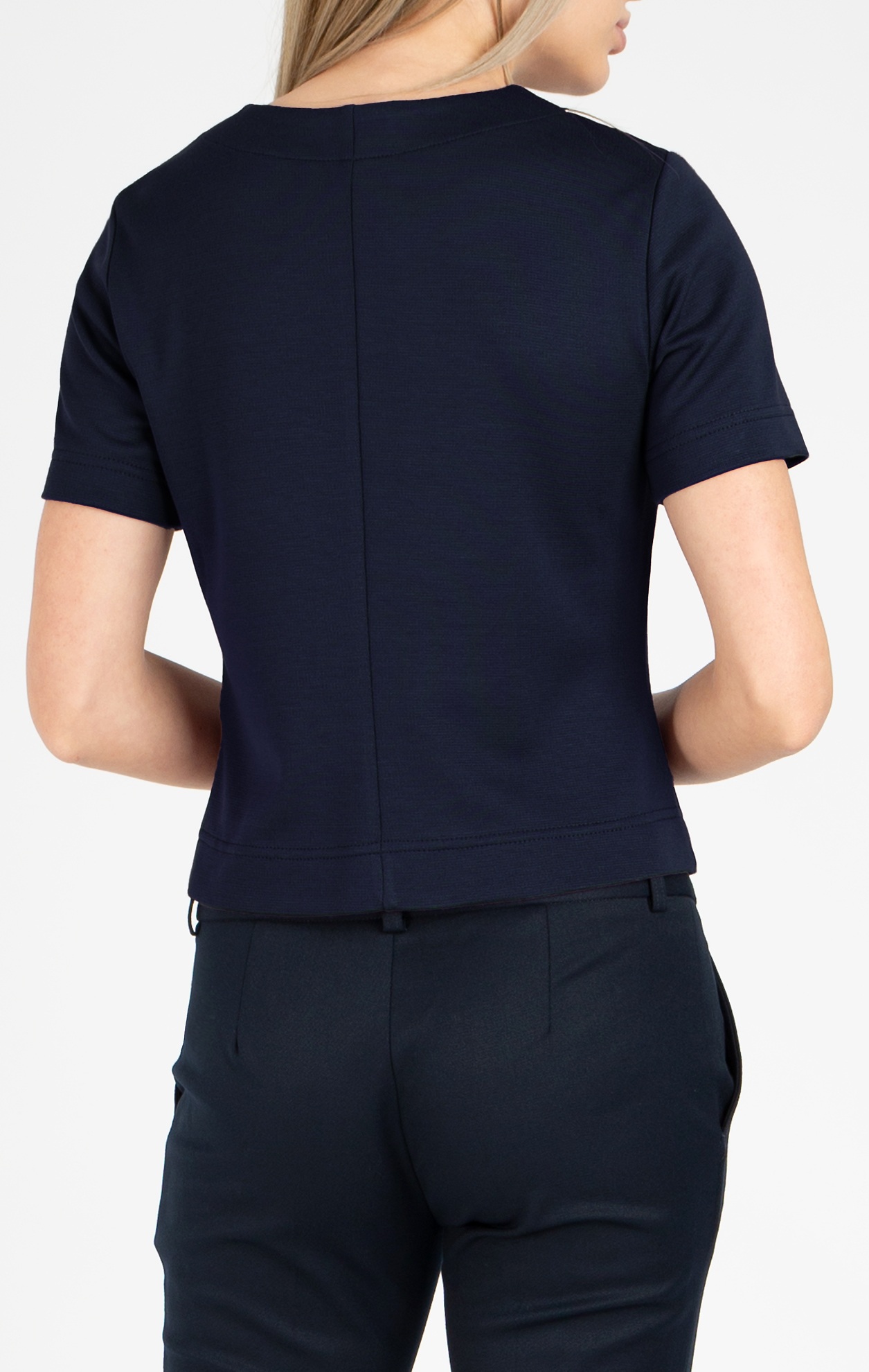 Късо трикотажно сако в цвят Night Sky. Моделът е с къс ръкав, закопчаване с копчета, без подплата. Изработено е от плътна трикотажна материя с леко втален силует. Комбинирайте с блуза с дълъг ръкав и поло яка в студените дни или носете като връхна дреха през преходния сезон.