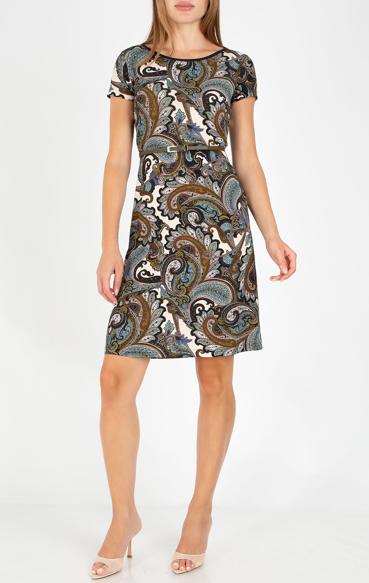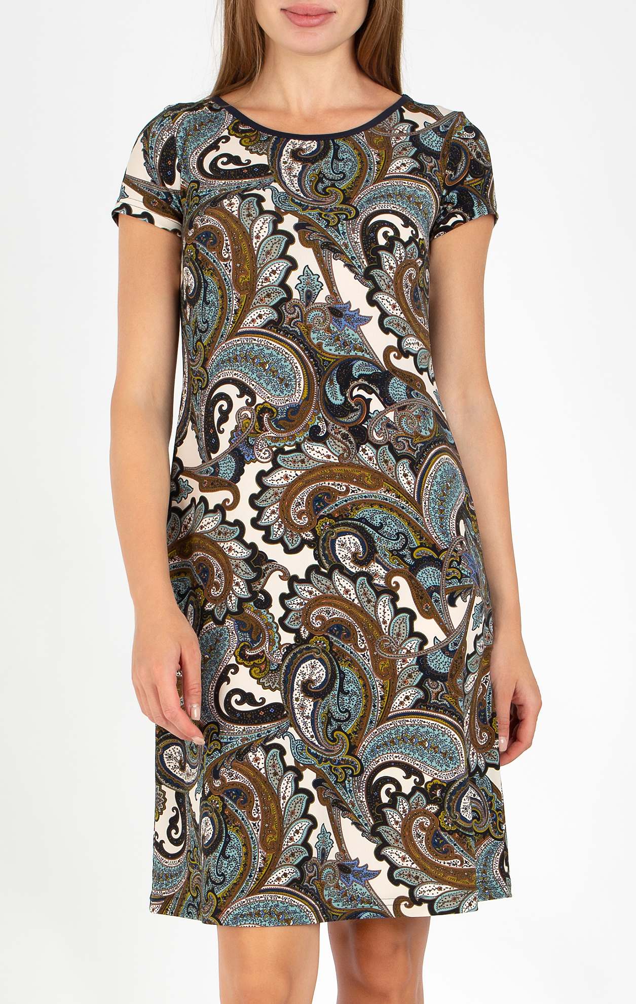 Комфортна лятна рокля от лека трикотажна материя, тип жарсе с пейсли мотиви в земни тонове. Роклята е с А - силует, обло деколте завършено с бие, с капковиден отвор на гърба. Материята е комфортна и лека и осигурява прохлада в летните дни.