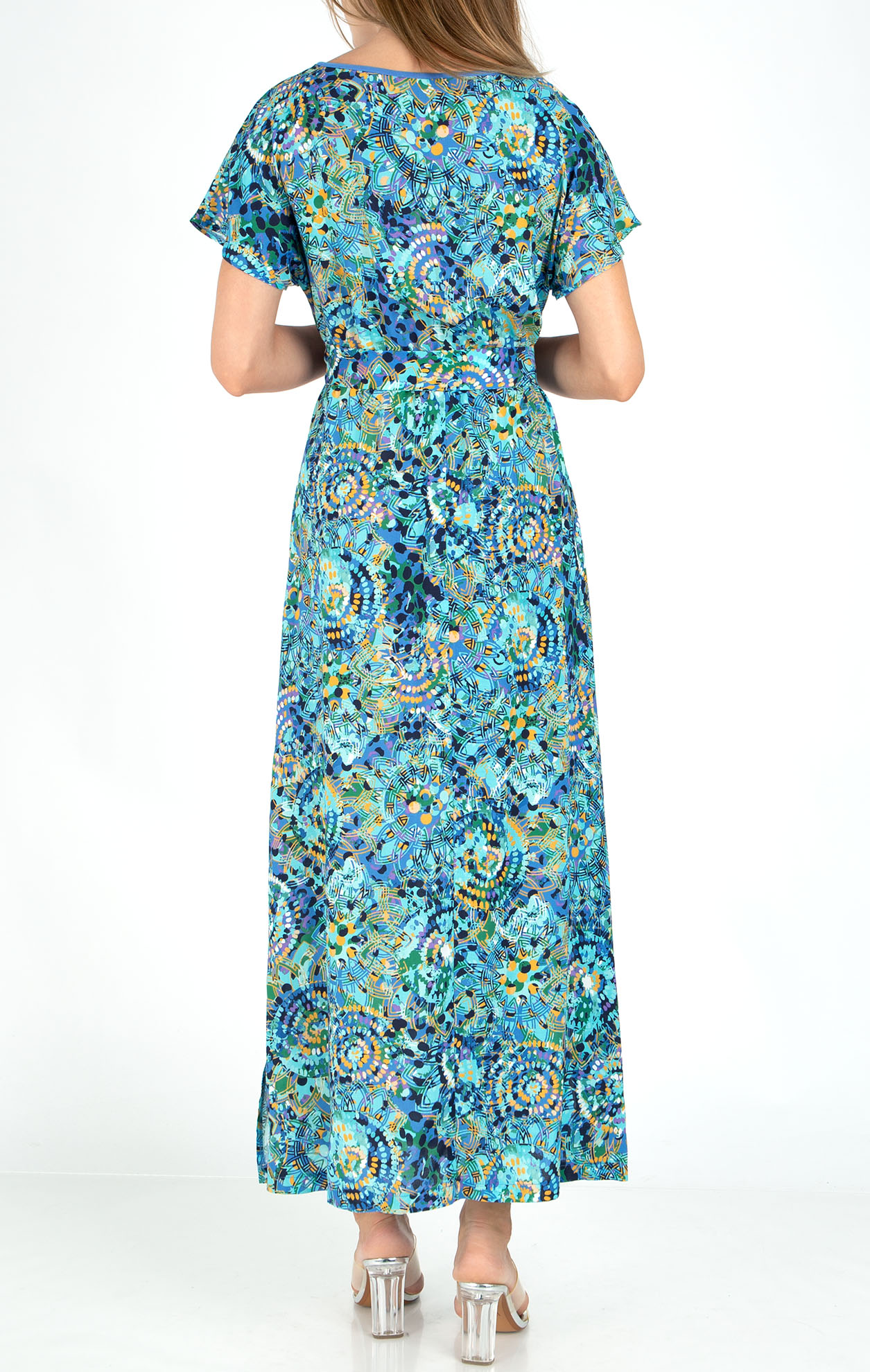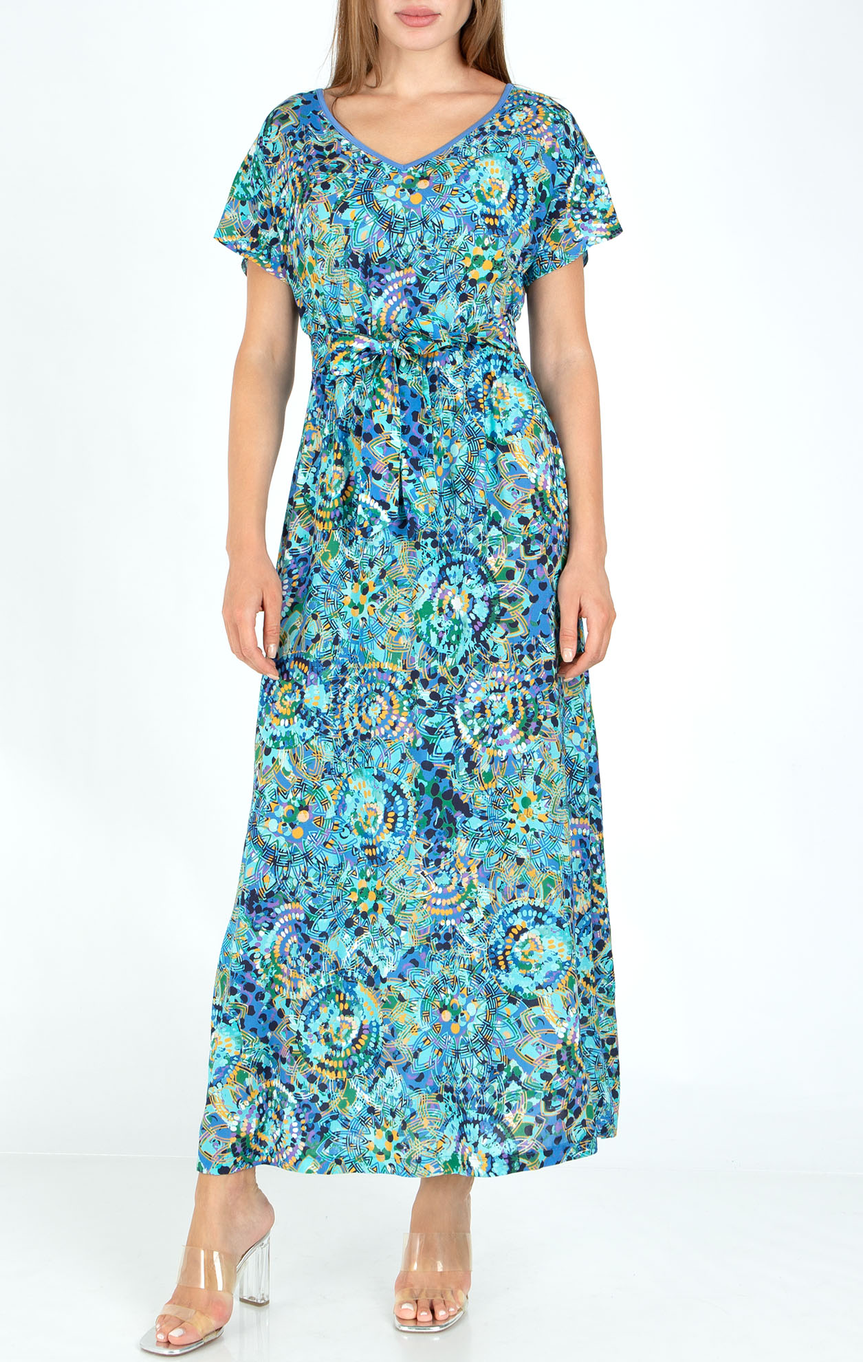 Ежедневна рокля в свежи ярки сини нюанси и десен тип “мандала”. Моделът е със свободен силует, изработен от мека, прохладна вискоза. Ластикът в талията и допълнителният колан в същия десен оформят и подчертават фигурата. Долната част е раздвижена със странични цепки, които осигуряват свобода на движението. Роклята е подходящо решение за топлите летни дни.