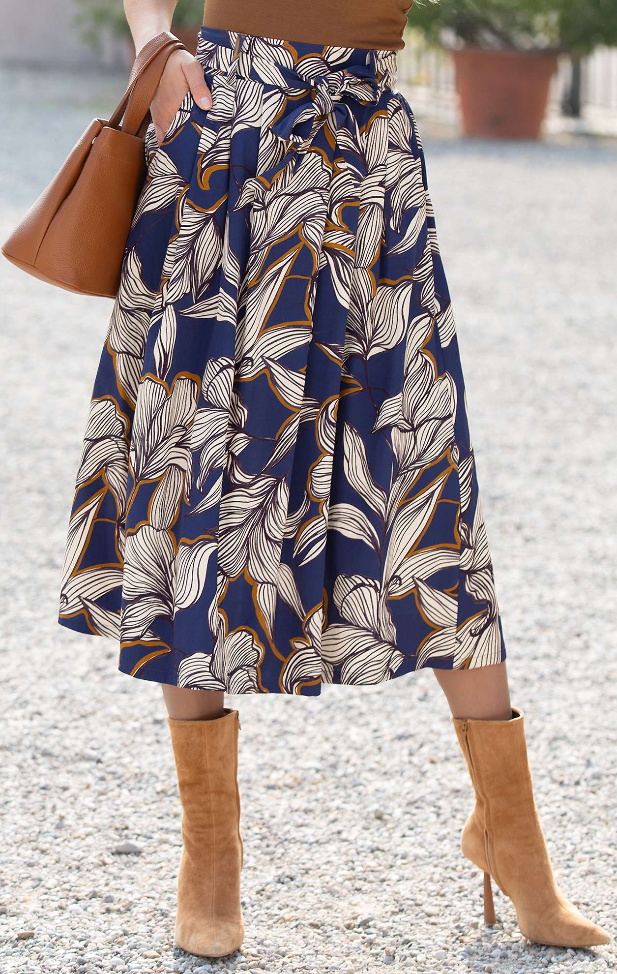 Разкроена миди пола с женствена линия от тежка, луксозна вискоза с флорални елементи в бяло и Golden Brown, които умело контрастират върху основа в цвят Deep Cobalt. Предната част е оформена с две групи дълбоки чупки, които падат красиво към подгъва. За повече удобство са добавени широк ластик на гърба и странични джобове. Талията е елегантно подчертана с широк, декоративен колан. Полата е с модерна и универсална визия. Съчетайте с блуза и сако или жилетка от разнообразната колекция на Daphne.