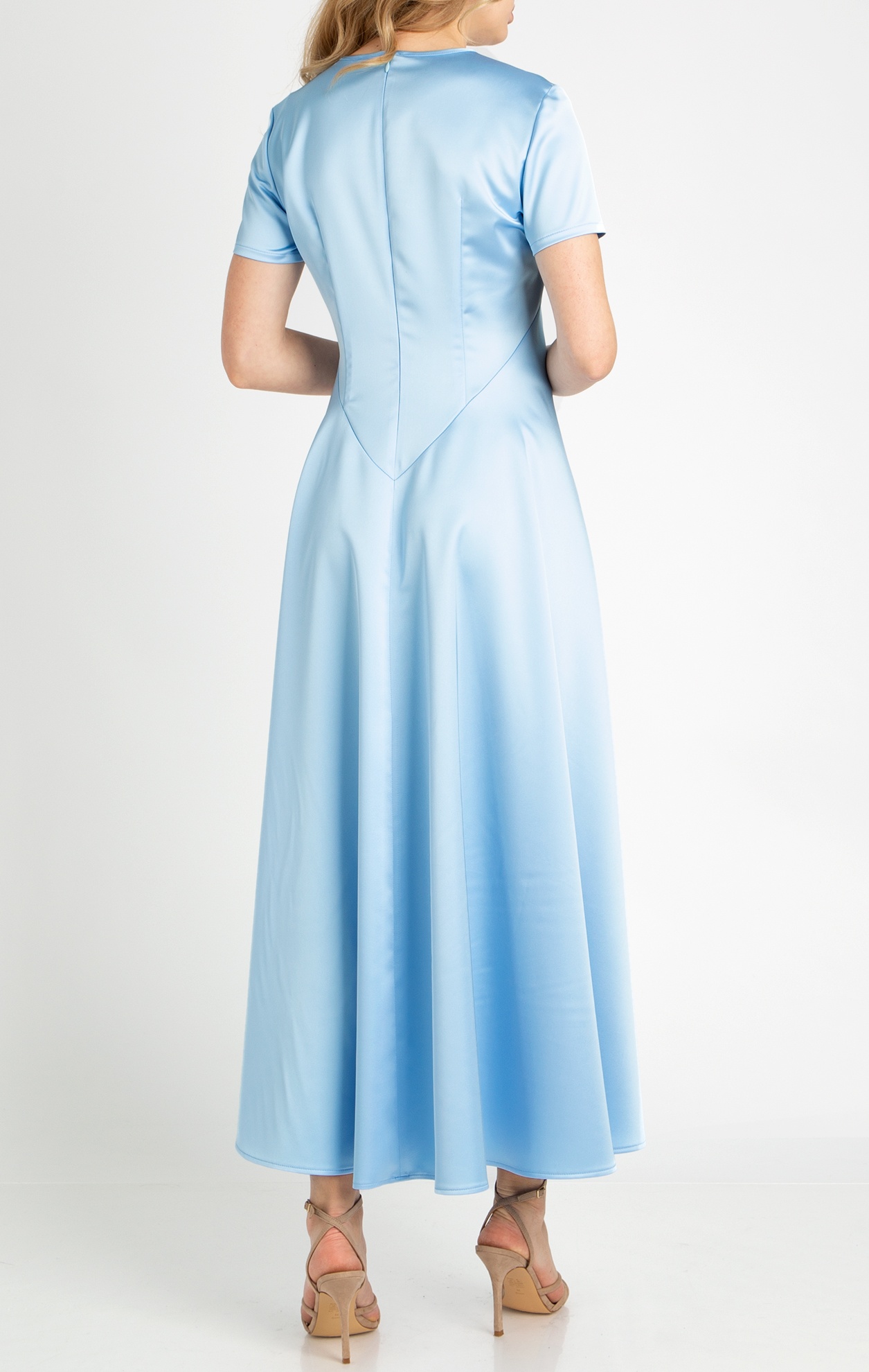 Официална рокля в макси дължина с асиметричен подгъв, изработена от нежна сатенирана материя в цвят Airy Blue. Роклята е с вталена горна част, свободно падаща от талията разкроена пола създаваща красота при всяко Ваше движение. Моделът е с къс ръкав и закопчаване на гърба, без подплата. Специална рокля за Вашия специален повод.