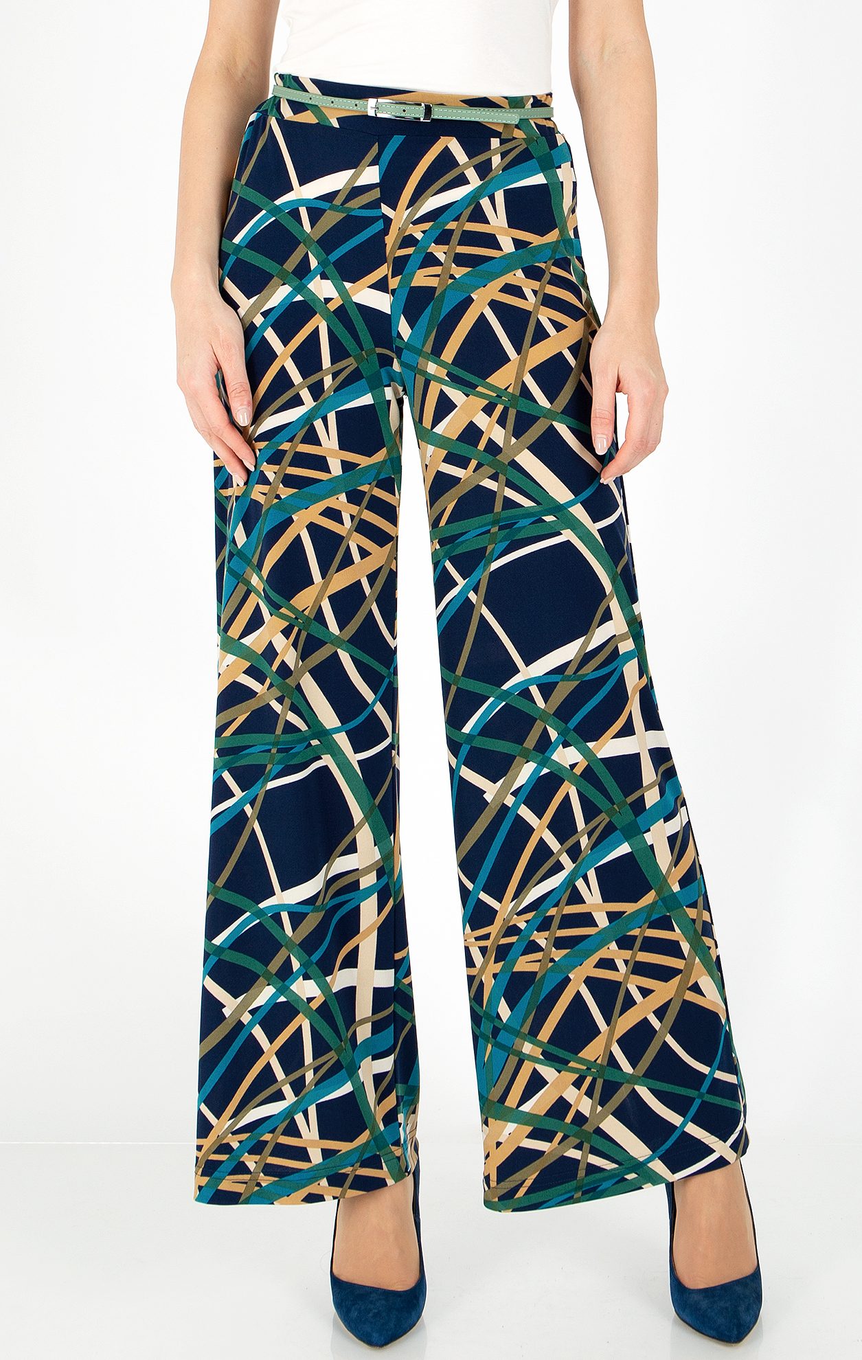 Панталон от лекo трико в свободен силует в тъмносин цвят с графичен принт. Моделът е със широки крачоли и ластик в талията, изработен от леко трико тип жарсе с динамичен графичен принт. Лек и удобен панталон за носене през топлите месеци. Комбинирайте с Предлага се в размери от S до 3XL.