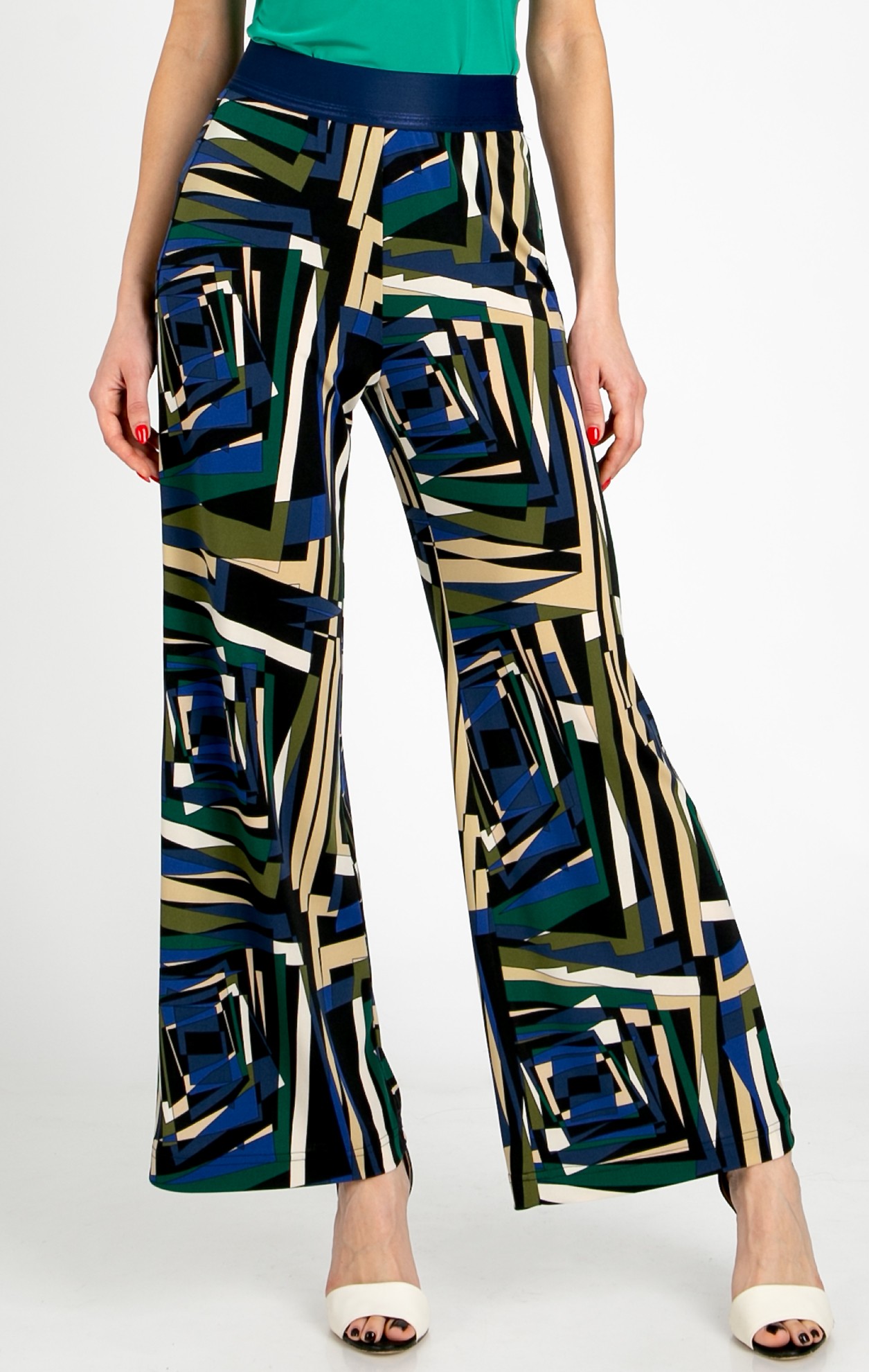 Панталон от трикотажна материя тип жарсе с абстрактен геометричен принт в цвят Royal Blue, Green Olive и Ecru. Този модел в свободен силует е изключително удобен за носене през целия ден - както свободните дни, за работа или пътуване. Нашата прецизна кройка стои елегантно на почти всяка фигура, като разкроената линия издължава фигурата. Луксозният ластик в талията осигурява допълнителен комфорт. Лесно може да се комбинира с широката гама блузи Daphne.