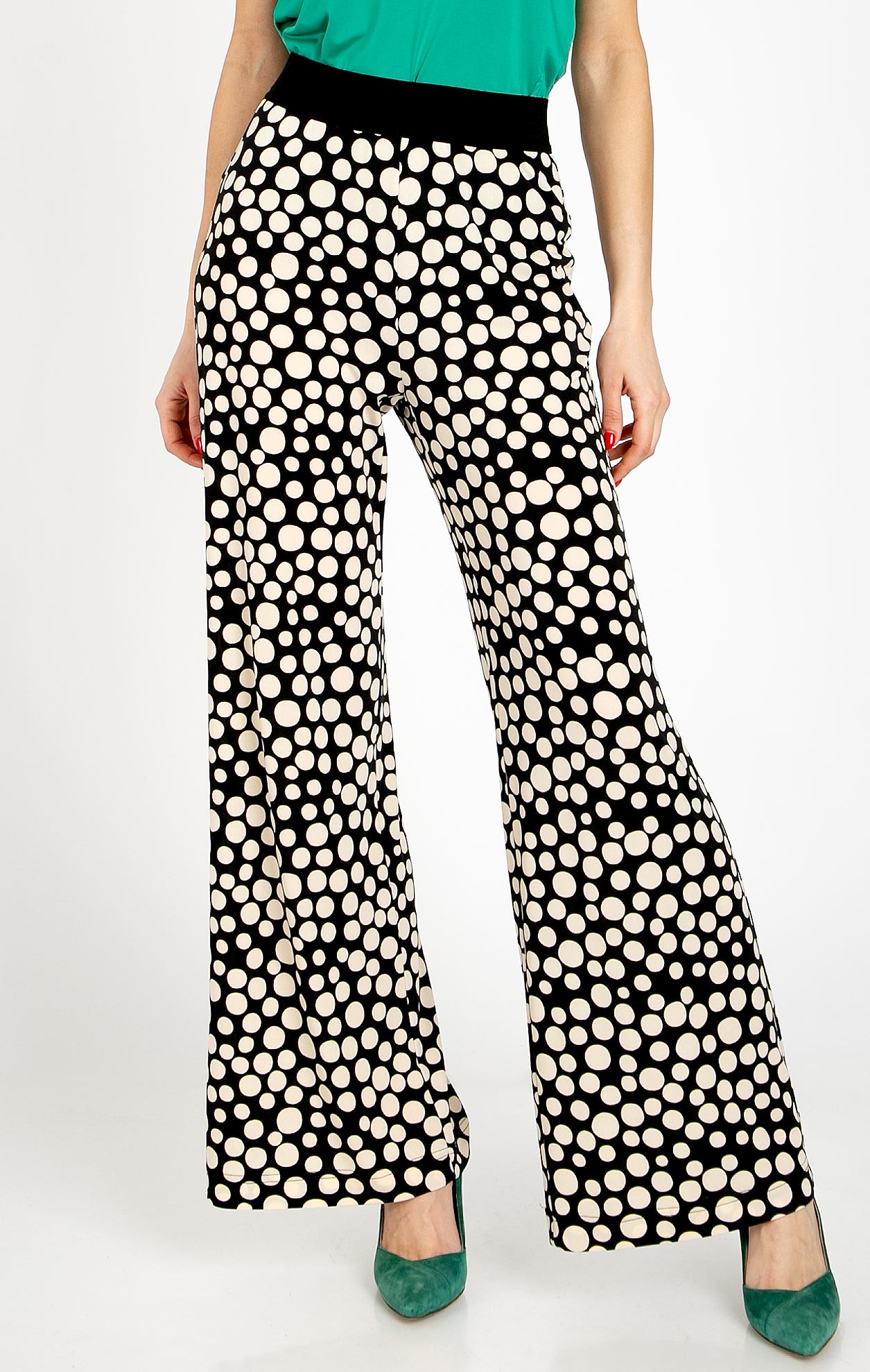 Панталон от трикотажна материя, тип жарсе с ефектен принт на големи точки. Този модел в свободен силует е универсален, лесен за съчетаване и изключително удобен за носене през целия ден - както за работа, пътуване или за излизане вечер. Нашата прецизна кройка стои елегантно и стилно на почти всяка фигура, като разкроената линия издължава крака, а ластикът в талията осигурява допълнителен комфорт.