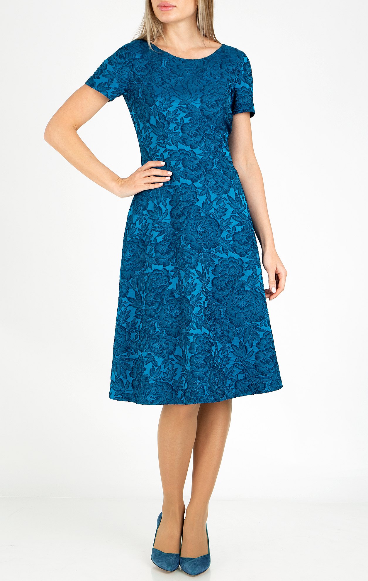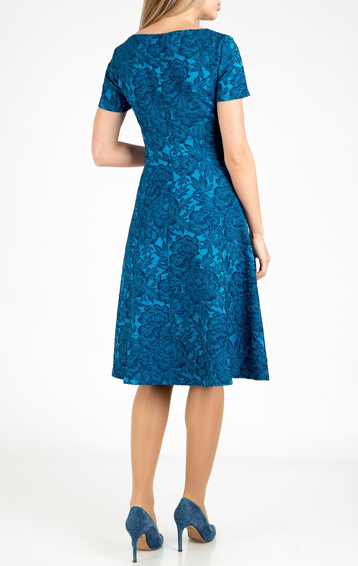 Разкроена официална рокля от сатениран жакард в цвят Blue Sapphire с красиви флорални мотиви