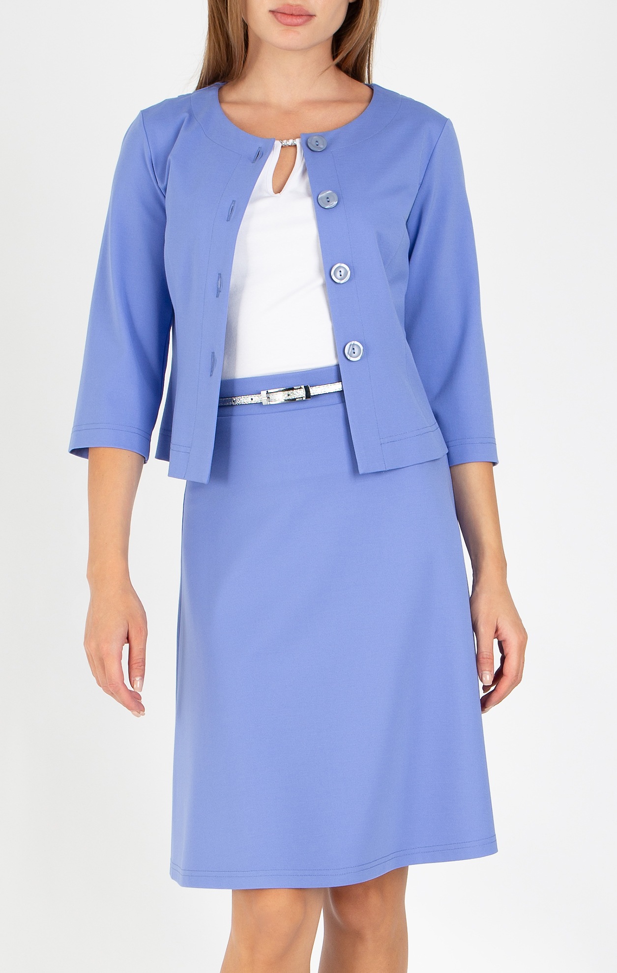 Разкроена пола от стегнато трико във виолетово син цвят, който носи усещане за нежност и женственост. Моделът е с дължина около коляното и широк ластик в талията за повече комфорт. Изчистената визия на полата я прави подходящ избор за офис, официални срещи, както и за по-елегантно ежедневно облекло. Може да се комбинира със сако Daphne от същия десен.
