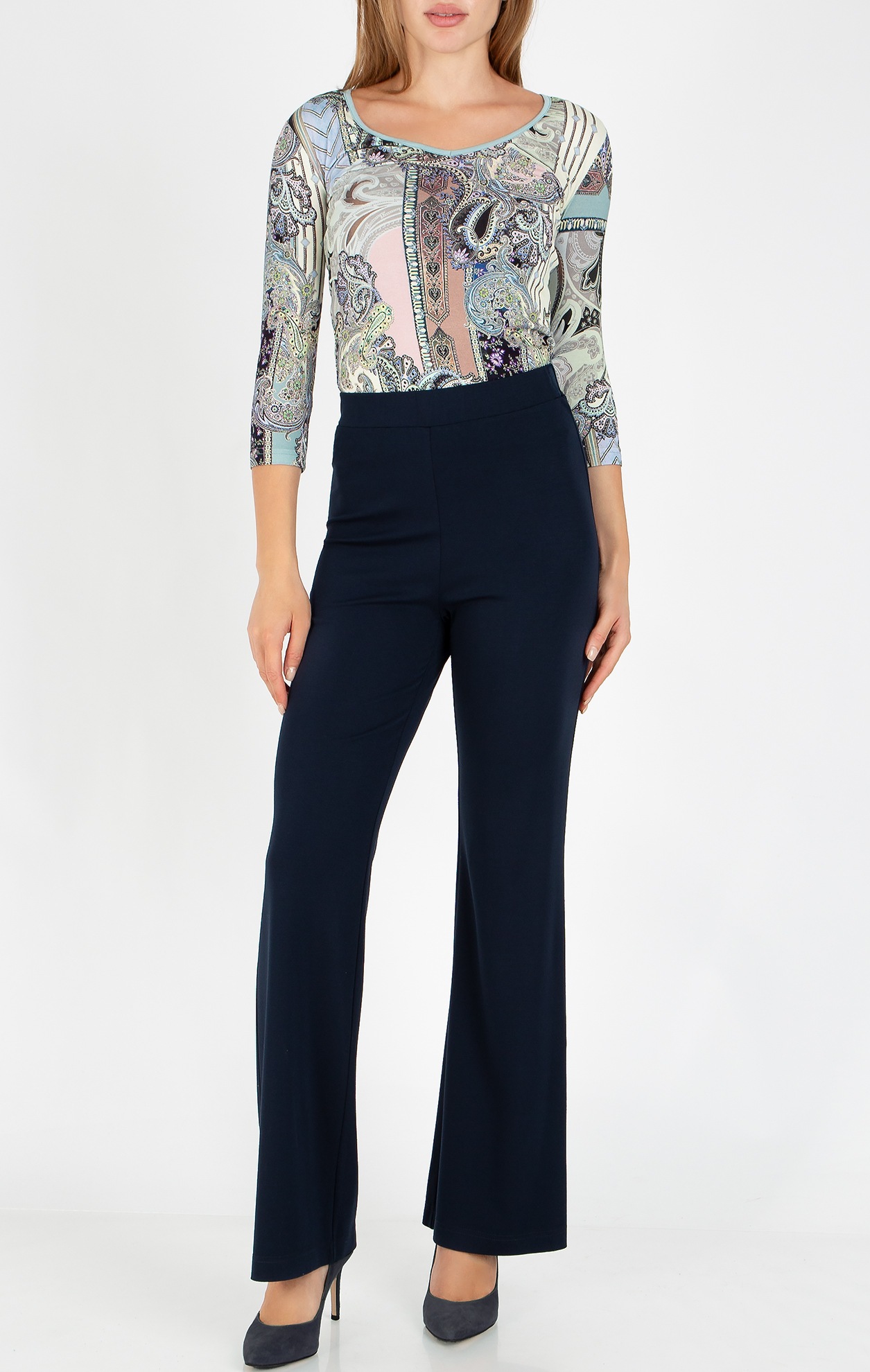 Удобен панталон от еластично трико в тъмно син цвят - Deep Blue. Моделът следва линията на тялото до коляното, след което се разширява плавно до подгъва. Еластичната материя и перфектна кройка издължават и подчертават женствения силует. Универсалният и изчистен модел на панталона позволява с лекота да се създават разнообразни визии - както елегантни, така и ежедневни.