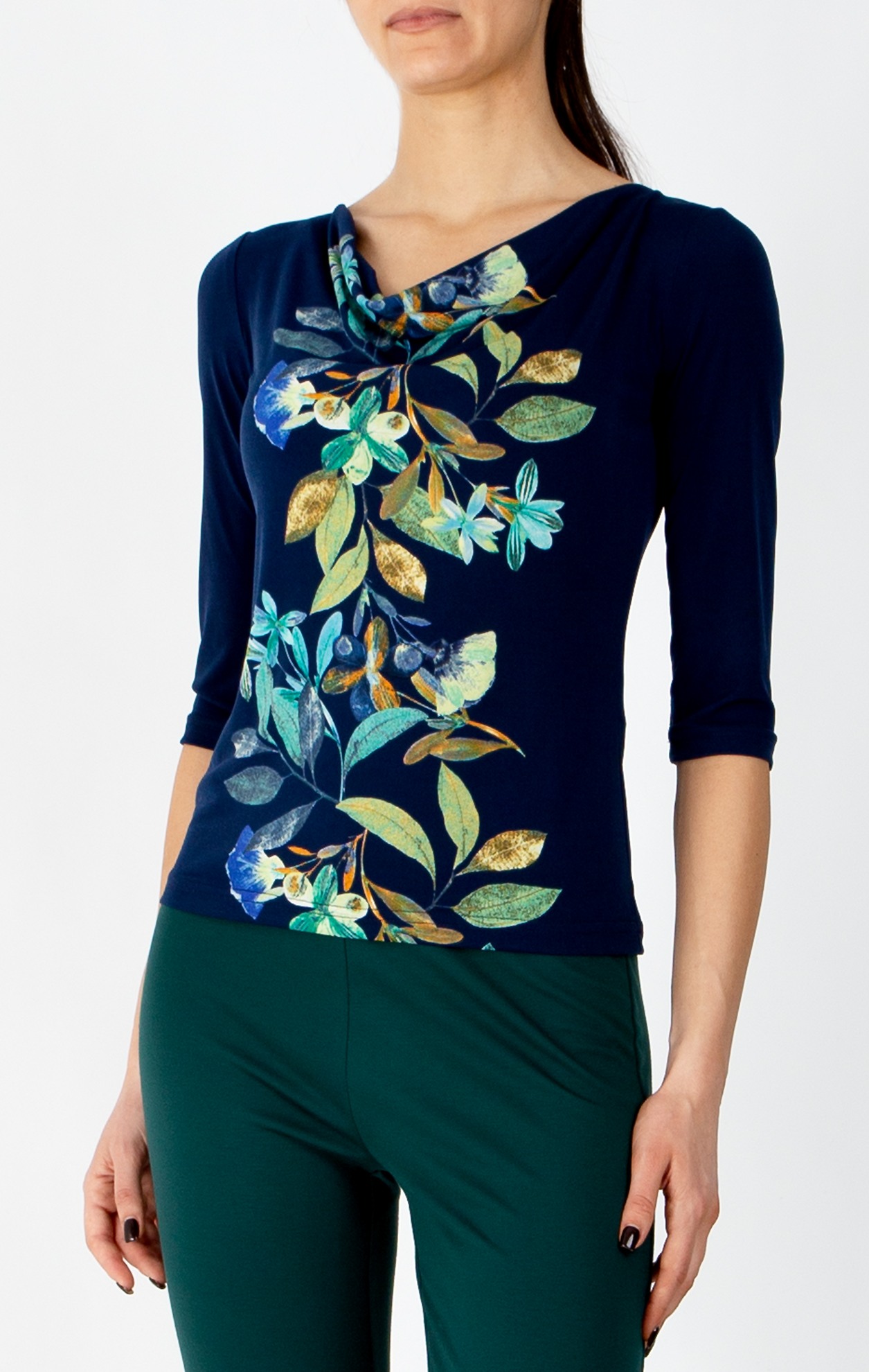 Стилна блуза с драпирано деколте в цвят Evening Blue с вертикален флорален принт, който визуално издължава силуета. Моделът е втален, с 3/4 ръкав и ефектно драпирано деколте, което красиво подчертава шията, изработен от еластично трико тип жарсе. Универсален модел, който лесно се комбинира със сака, жилетки или панталони - идеален избор за съвременна градска визия.