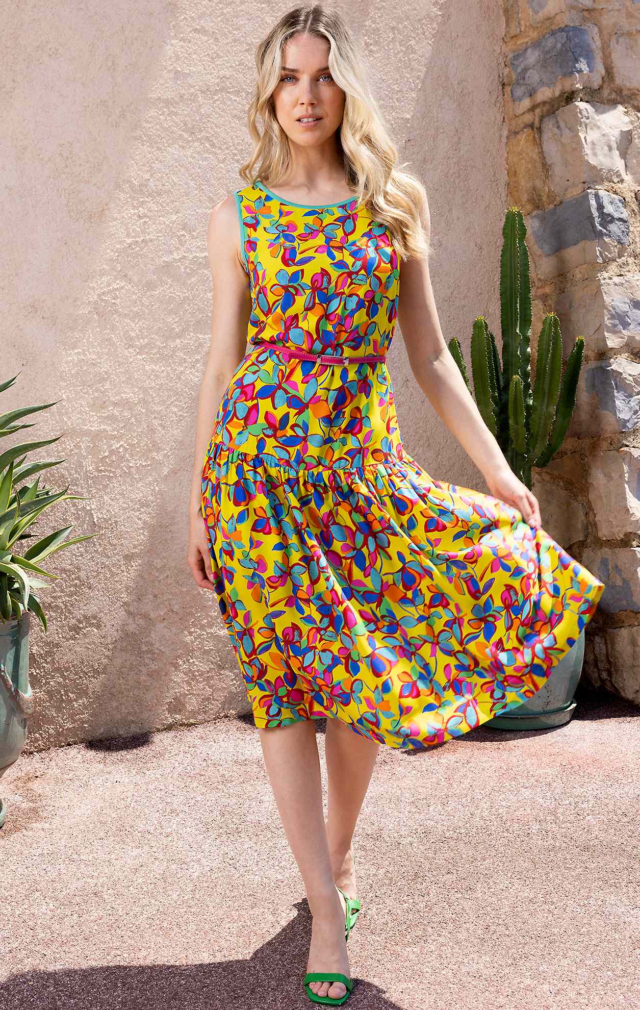 Свежа лятна рокля в жълто Celery с ярък флорален принт в Aqua Green и Fuchsia. Моделът е с елегантна миди дължина, свободен силует с волан в долната част, който придава игрива и женствена линия. Може да подчертаете талията с цветен кожен колан от колекция Daphne или да я носите свободно. Чудесен избор за безгрижните летни дни изпълнени с цветно настроение.