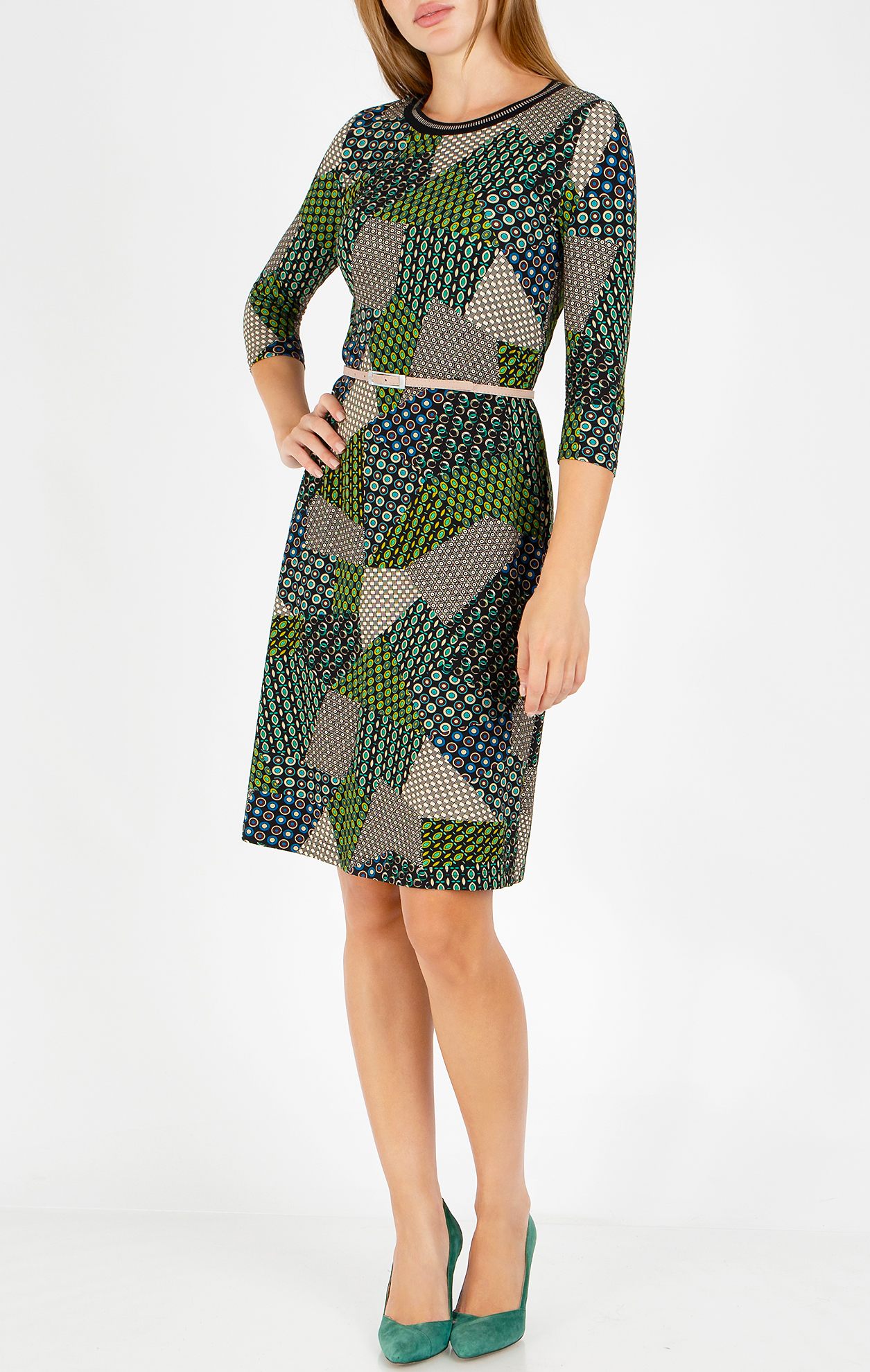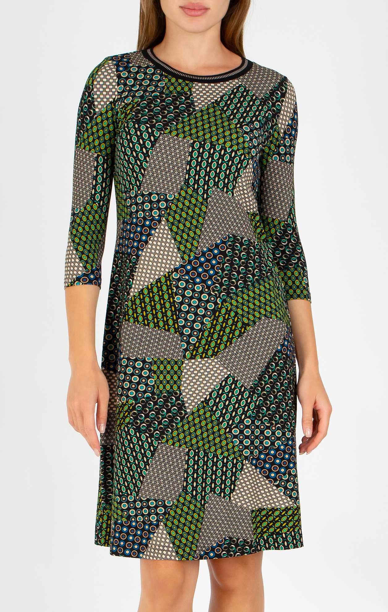 Практична трикотажна рокля с графични елементи в синьо - зелена гама, изработена от еластична трикотажна материя, която обгръща комфортно фигурата и гарантира удобство в ежедневието. Моделът е леко разкроен и подхожда на всяка фигура. Роклята е с обло деколте, завършено с плетено бие, с 3/4 ръкав, без подплата. Комбинацията с колан Daphne придава офис елегантност и стил.