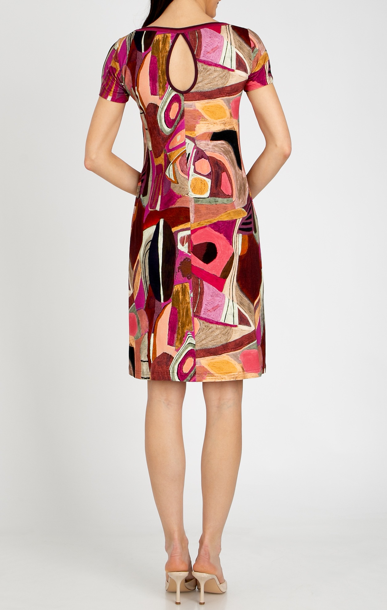 Удобна трикотажна рокля в абстрактен графичен принт в Brick и Fuchsia. Моделът е с къс ръкав, лодка деколте завършено с двуцветно бие, класическа дължина до коляното и капковиден отвор на гърба. Свободният силует осигурява комфорт и лекота, без да ограничава движенията, и е подходящ за всеки тип фигура. Тази рокля е стилен избор за жените, които търсят модерна и свежа визия. Предлага се в размери от 36 до 46.