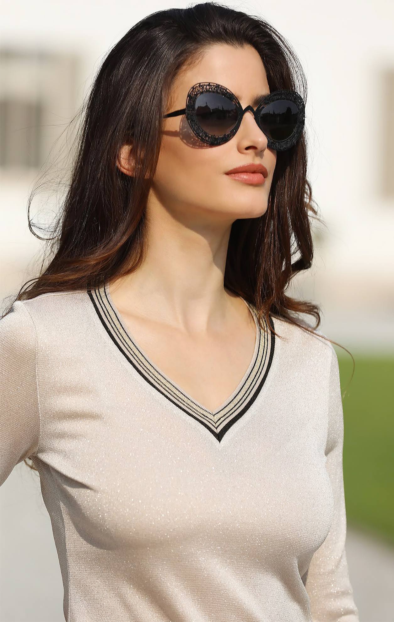 Вталена блуза с V деколте в светло бежово със сребърен блясък. Моделът с V-деколте красиво подчертава линията на шията, а красивата трикотажна материя привлича със своя деликатен блясък. Може да бъде съчетана с елегантен панталон или пола. Този модел е чудесен избор както за ежедневието, така и за специални поводи като вечери и празнични събития. Предлага се в размери от 36 до 46.