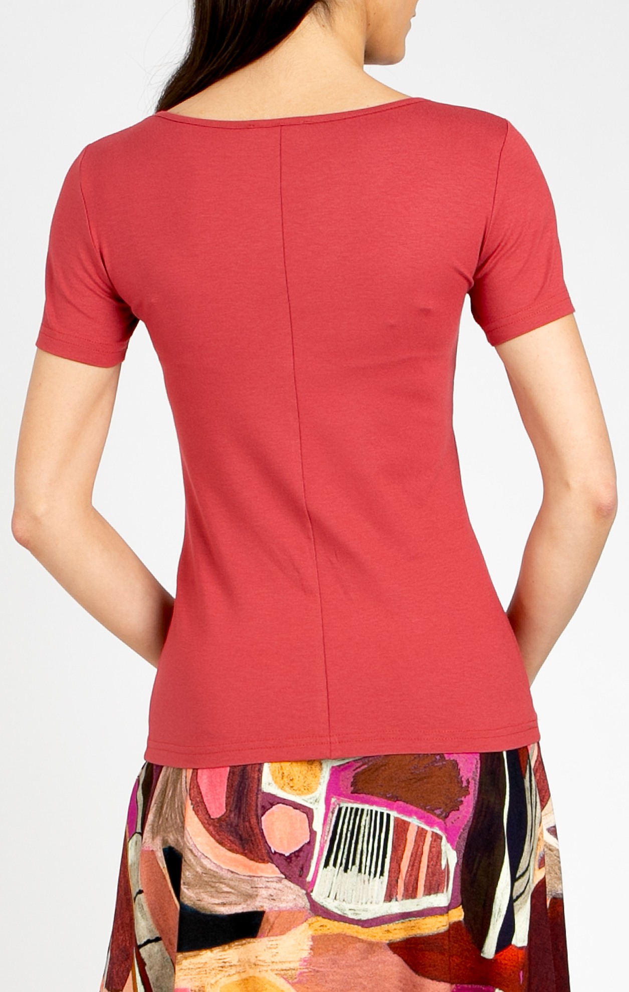 Вталена блуза с къс ръкав в цвят Cranberry. Моделът е с отворено обло деколте завършено с бие, къс ръкав и малко метално лого с формата на сърце.. Блузата е изработена от меко трико и приляга нежно по тялото. Удобна блуза за ежедневието и офиса, която лесно може да комбинирате с различни модели поли и панталони.