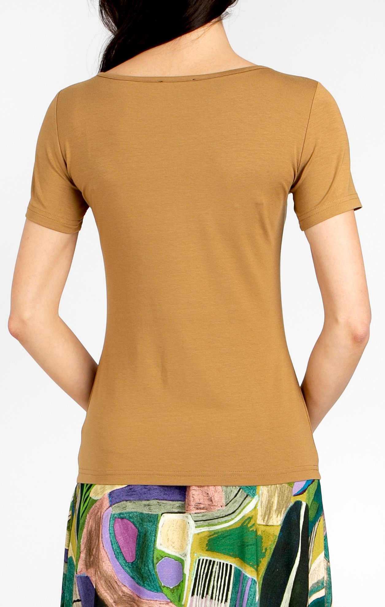 Вталена блуза в цвят цвят Medal Bronze. Моделът е с обло деколте завършено с бие и къс ръкав. Изработена от меко трико, леко приляга по тялото и осигурява комфорт през целия ден. Лесно се съчетава с поли, панталони или деним по ваш избор