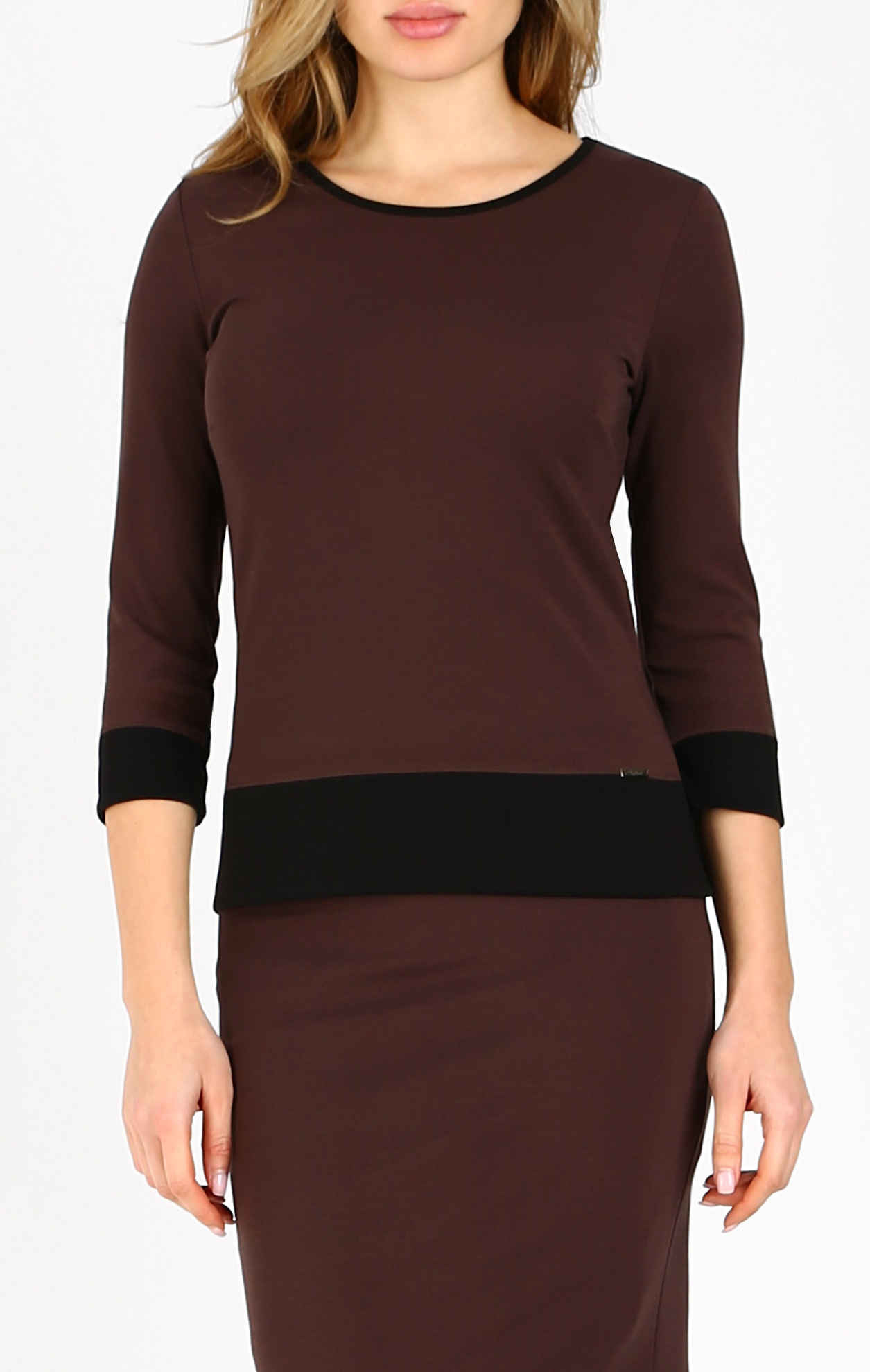 Стилна блуза от плътна трикотажна материя в цвят Chocolate Fondant, с обло деколте, завършено с черно бие, с 3/4 ръкав и ефектно завършване при подгъва и ръкавите с широка черна лента. Стегнатата материя моделира фигурата за безупречен силует. Универсален модел, който може да носите с поли или панталони и е подходящ както за офиса, така и за неформални срещи в забързаното ежедневие.
