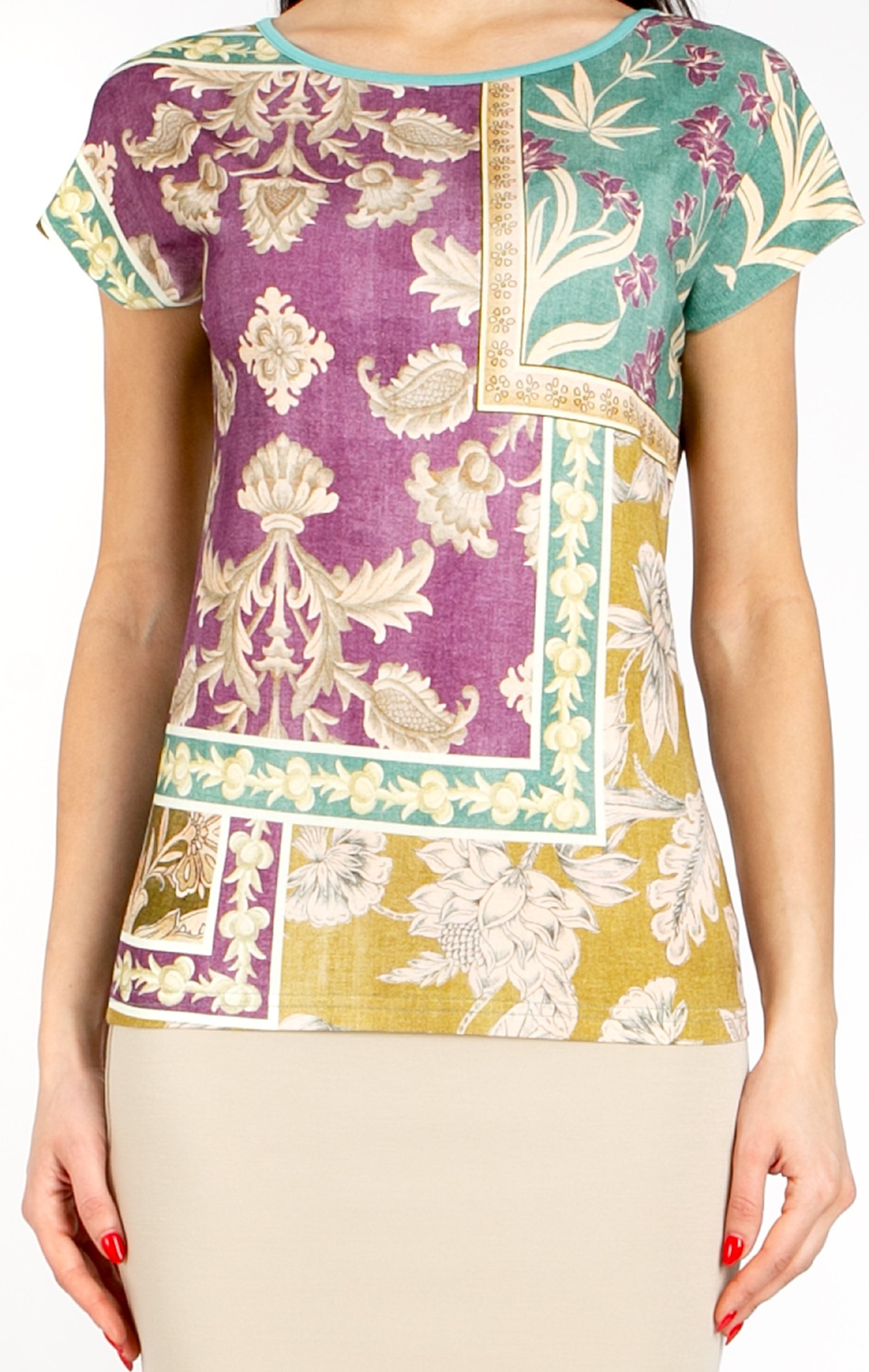 Елегантна блуза с артистичен пачуърк принт в богата и балансирана палитра от наситено лилаво, нежно тюркоазено и топли нюанси на горчица и охра. Моделът е в свободен силует, с паднало рамо и лодка деколте завършено с бие. Съчетайте я с пола тип „молив“ или панталон в бежовата гама за елегантен офис стил.