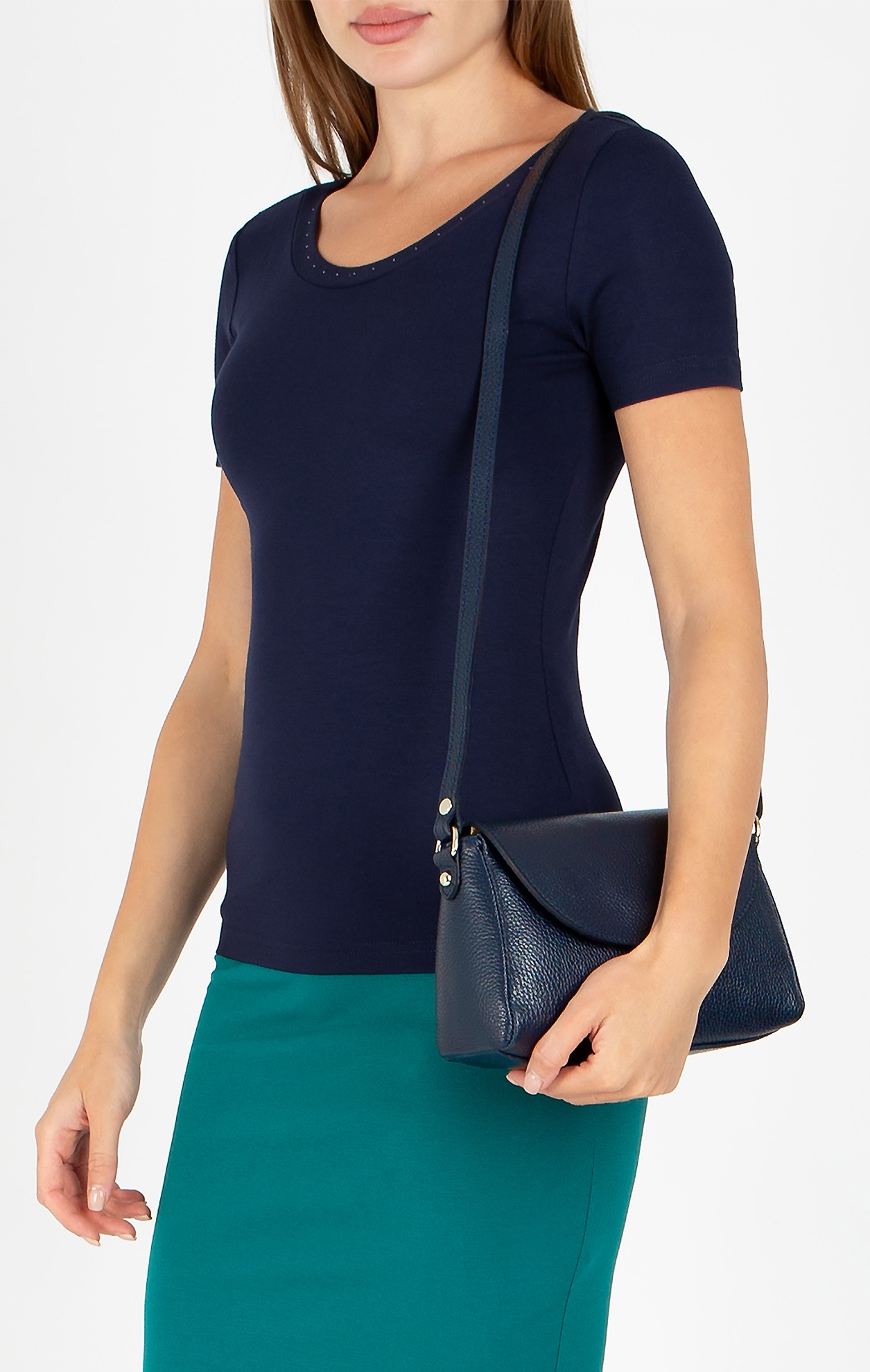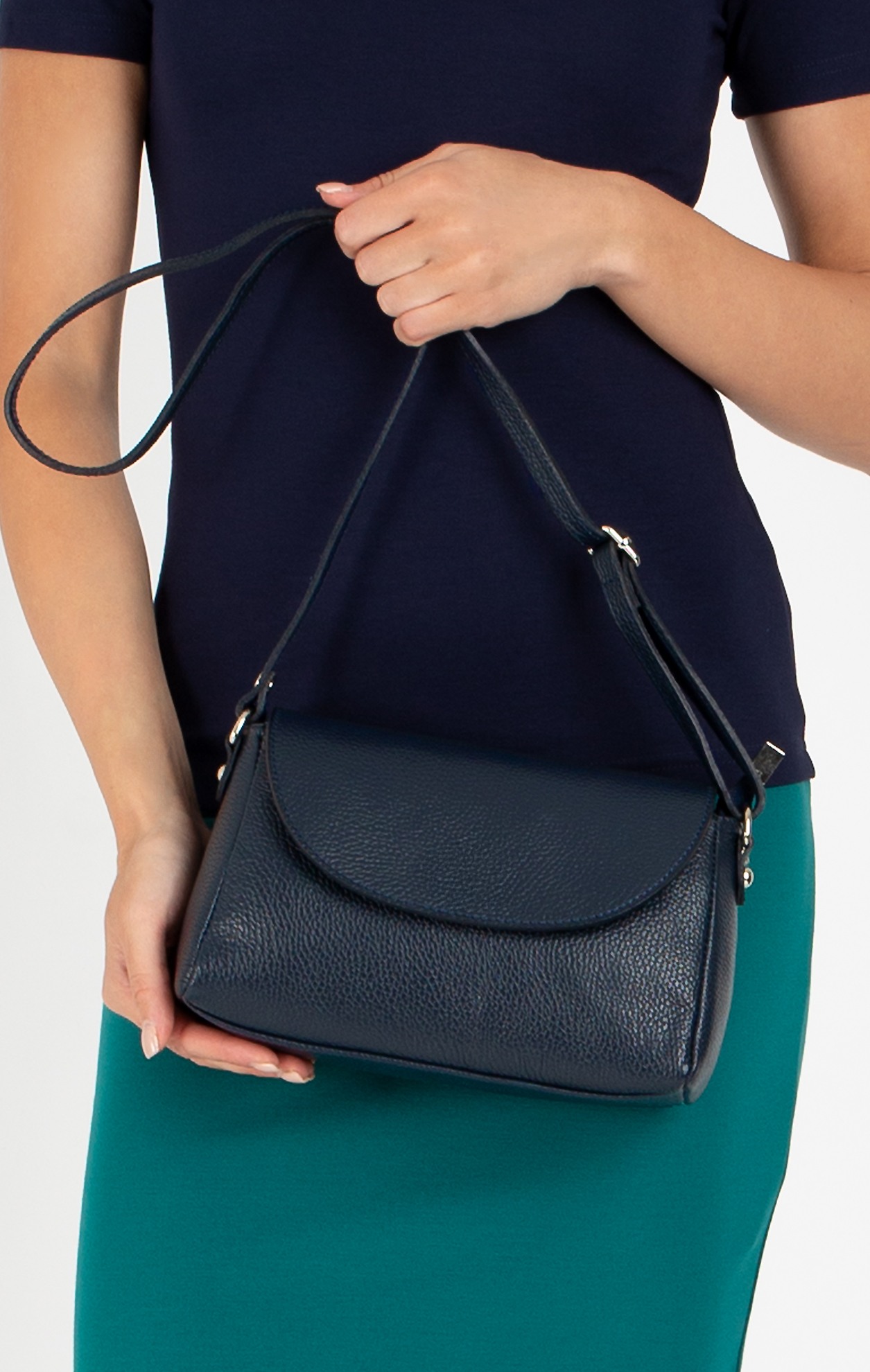 Малка чанта за през рамо от естествена кожа в цвят Indigo. Моделът е с едно отделение, затваря се с цип и разполага с малък вътрешен джоб и дълга регулируема дръжка. Чантата разполага и с допълнителен външен джоб с цип, a капакът се затваря с магнитно копче.