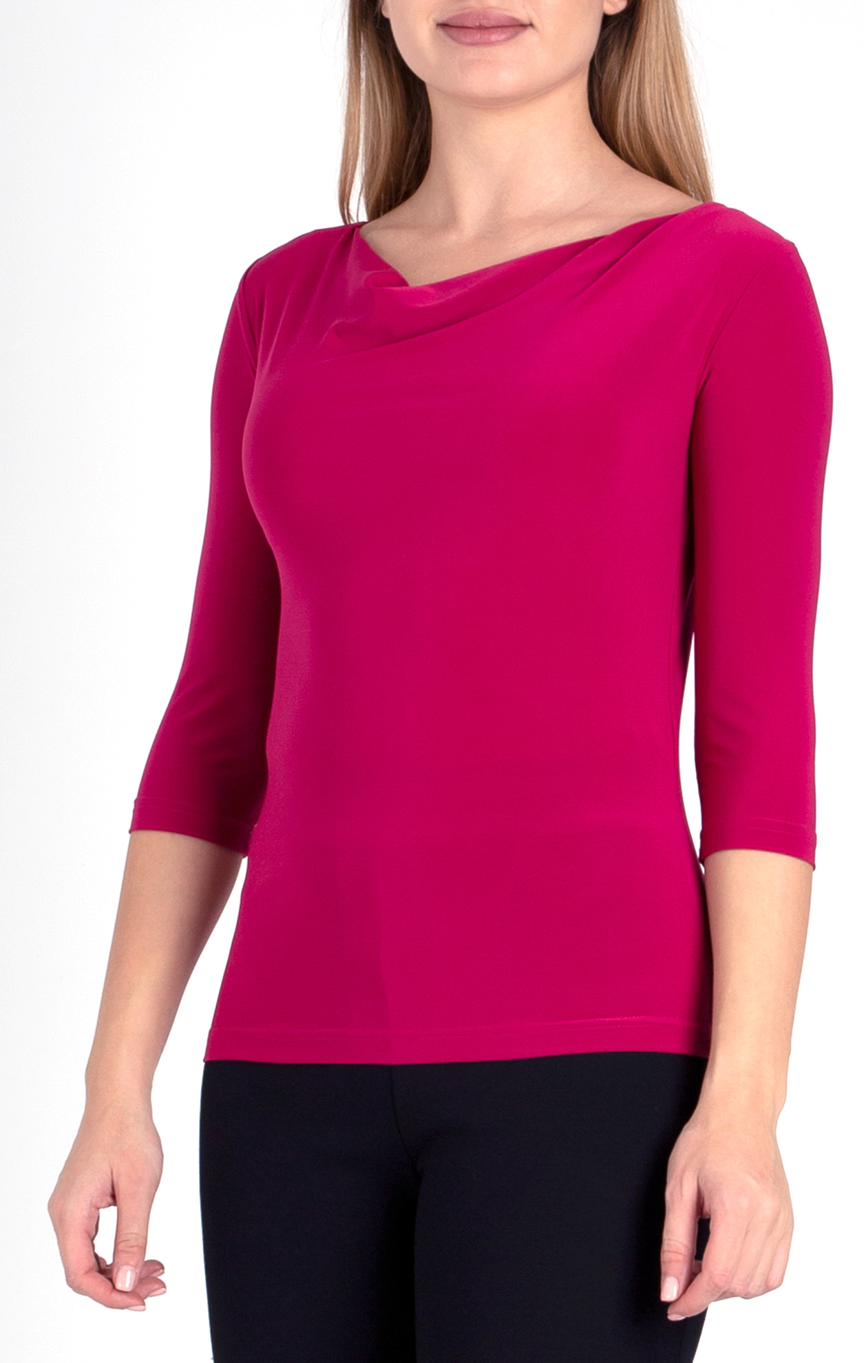 Стилна блуза, изпълнена от меко падаща трикотажна материя в елегантен цвят Fuchsia. Моделът е с ефектно драпирано деколте и с 3/4 ръкав. Нежна и удобна, което я прави подходяща за офиса и за ежедневието. За завършена визия, може да комбинирате с панталон или пола. Предлата се в размери от 36 (S) до 46 (3XL).