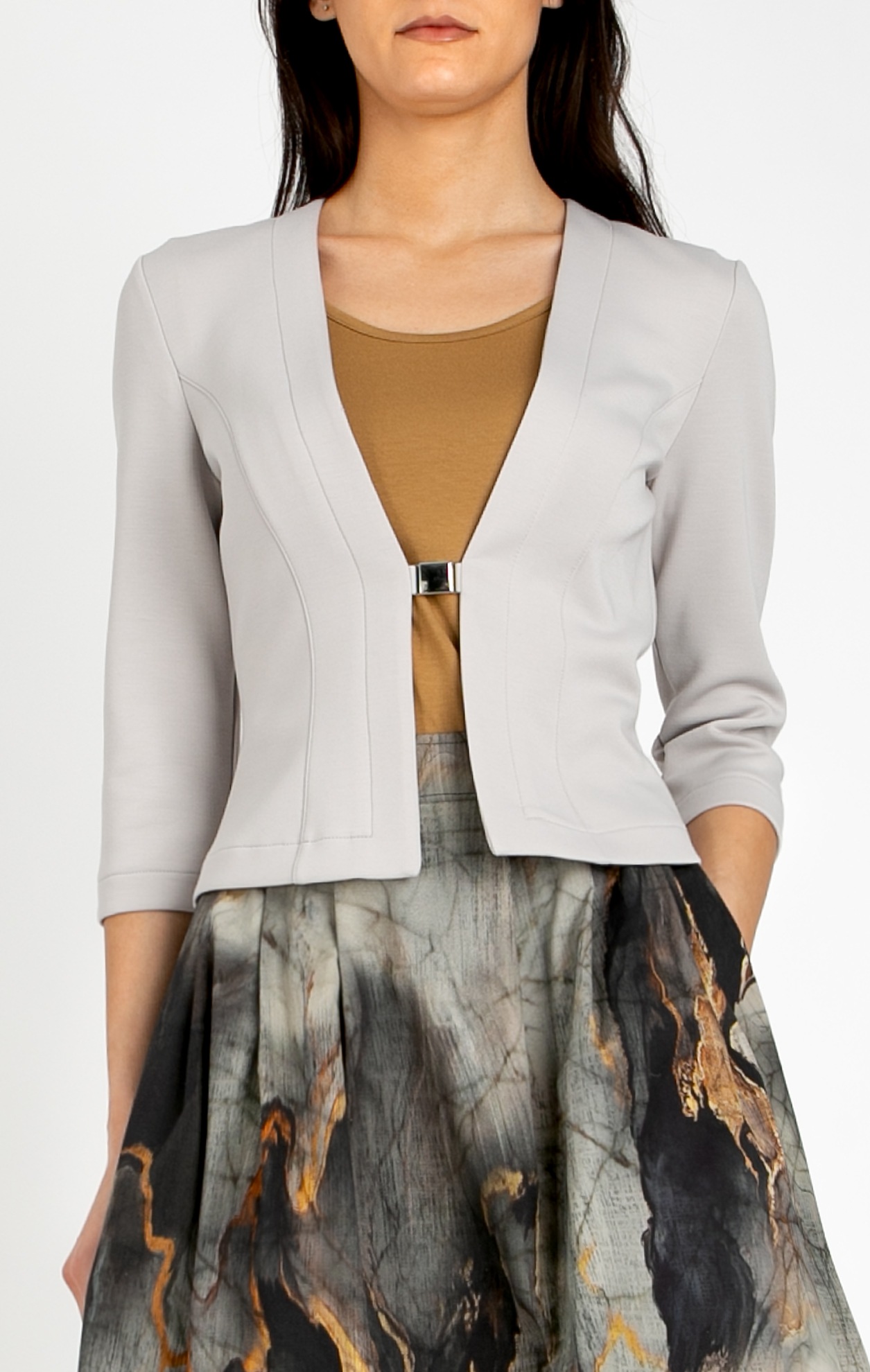 Стилно сако, изработено от висококачествена стегната трикотажна материя в изискан перлено-сив нюанс. Моделът е с 3/4 ръкав и фино метално закопчаване, които придават съвременен и завършен вид.Това сако е съвършеното допълнение към модерния гардероб, съчетаващо комфорта на трикото с класическа, премерена елегантност. Прецизната изработка подчертава силуета, като същевременно гарантира безупречна форма и усещане за комфорт през целия ден. Перфектно се съчетава с пола, панталон или официална рокля.